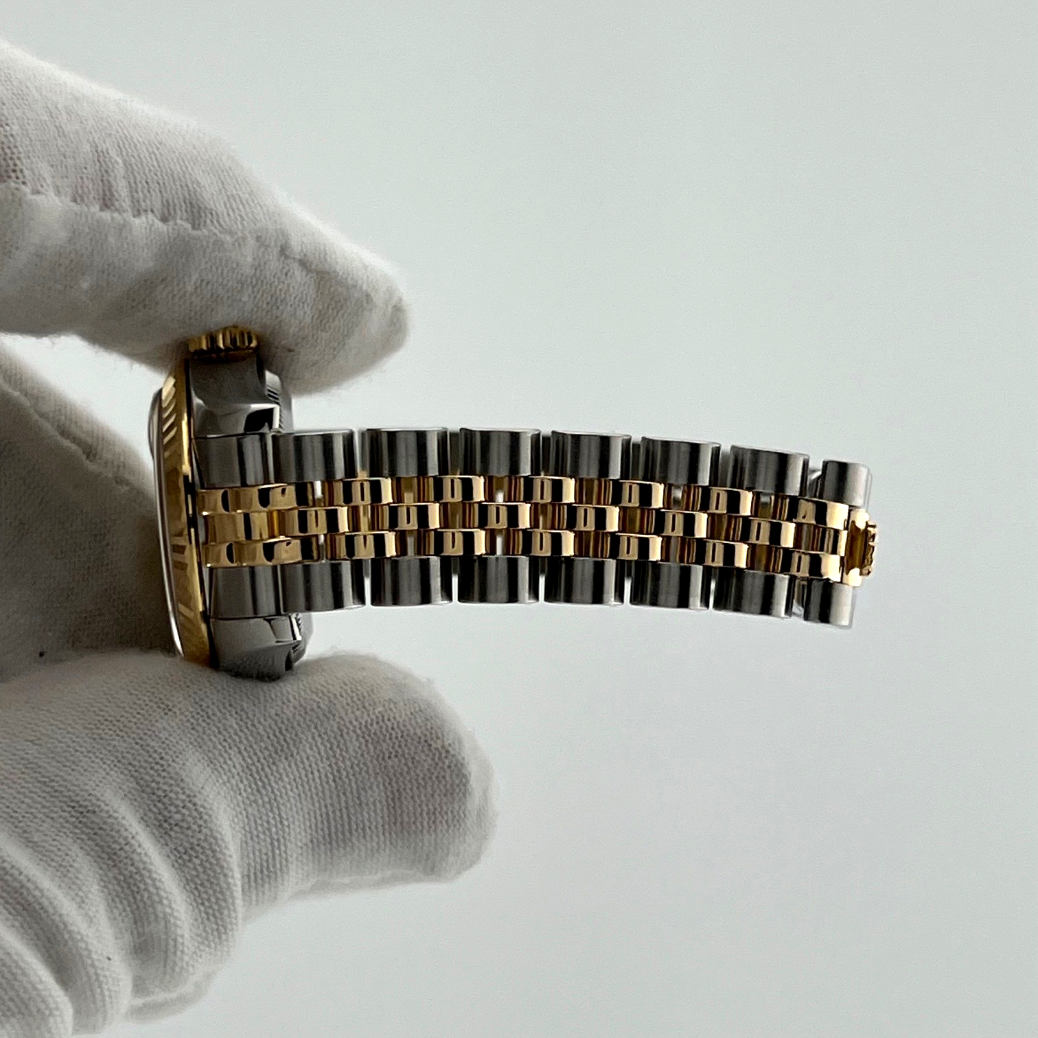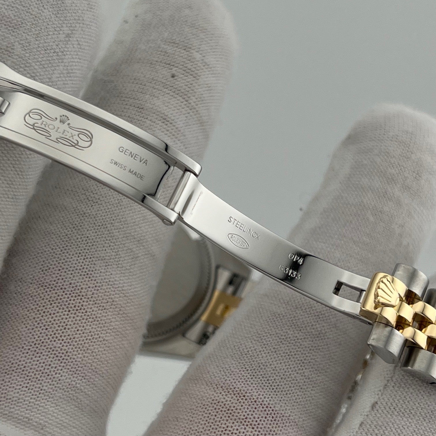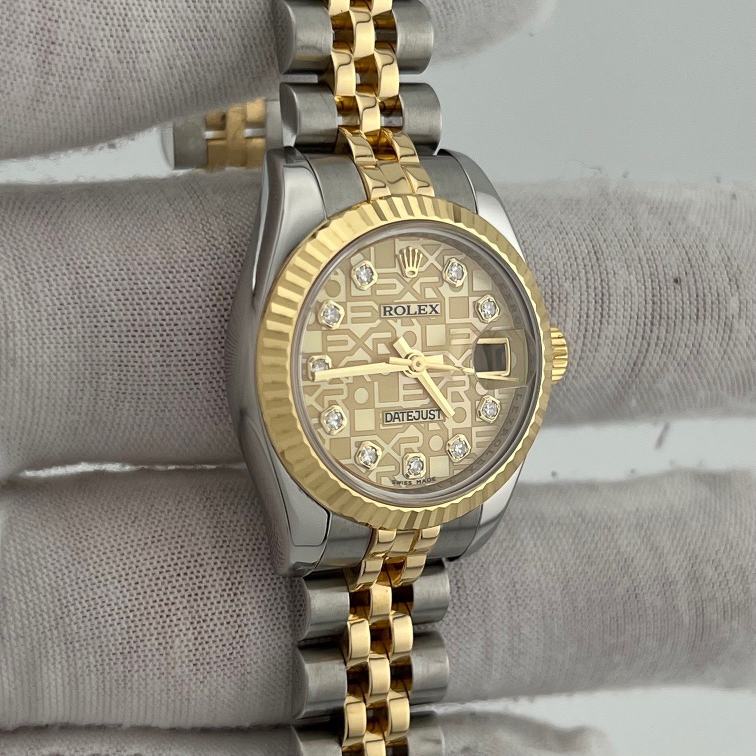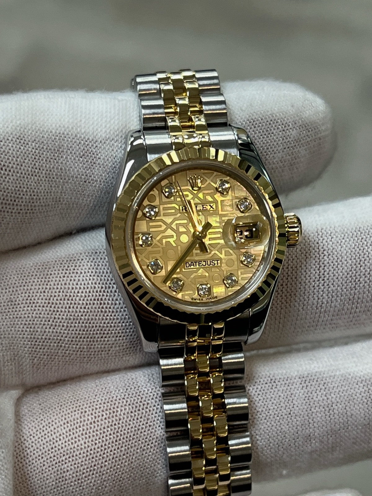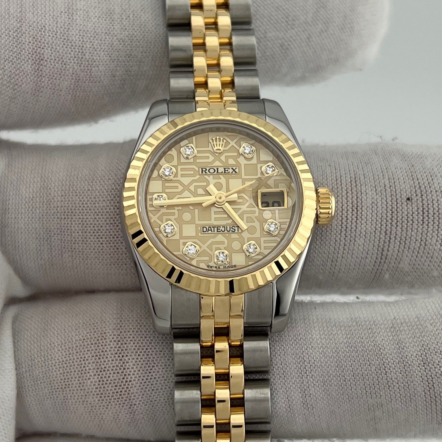 Rolex Lady Datejust 179173 26mm Mother of Pearl MOP Diamond Dial 18k Gold Steel Rolex Sale! from 1199500 /per This item is a recurring or deferred purchase. By continuing, I agree to the cancellation policy and authorize you to charge my payment method at the prices, frequency and dates listed on this page until my order is fulfilled or I cancel, if permitted. +1 (619) 232-1273 This item is currently on backorder but you can still purchase it now and we'll ship as soon as more become available. Style Number: 179173Serial: Z18****Year: 2006-2007 Model: Rolex Ladies Datejust Case Material: Stainless Steel Band: 18k Yellow Gold & Stainless Steel Jubilee Bezel: 18k Yellow Gold Fluted Dial: Rare Factory Champagne Mother Of Pearl Diamond Anniversary Dial Crystal: Sapphire Case Size: 26mm Includes: - Rolex Watch Box- Certified Appraisal - 1 Year WarrantySKU 22921 / 113710TOC081525