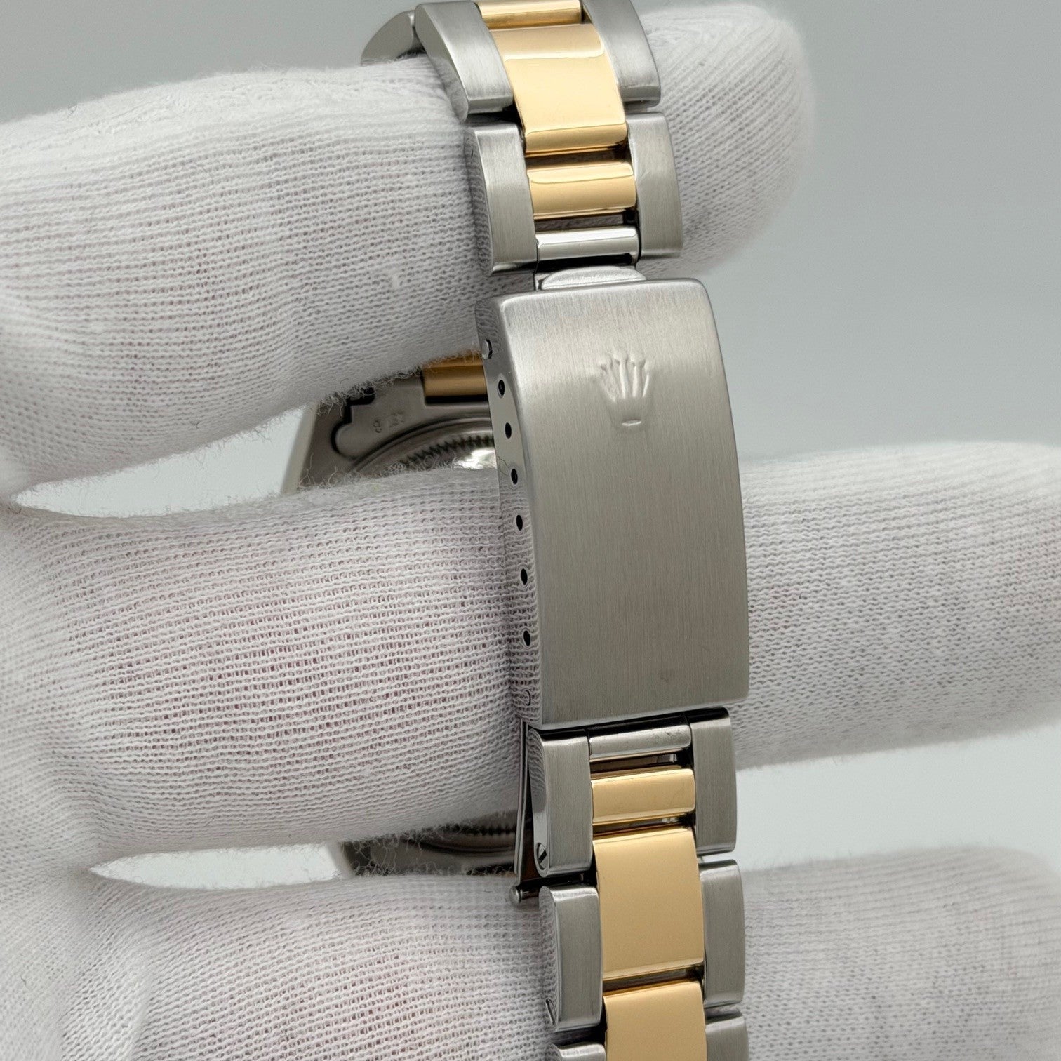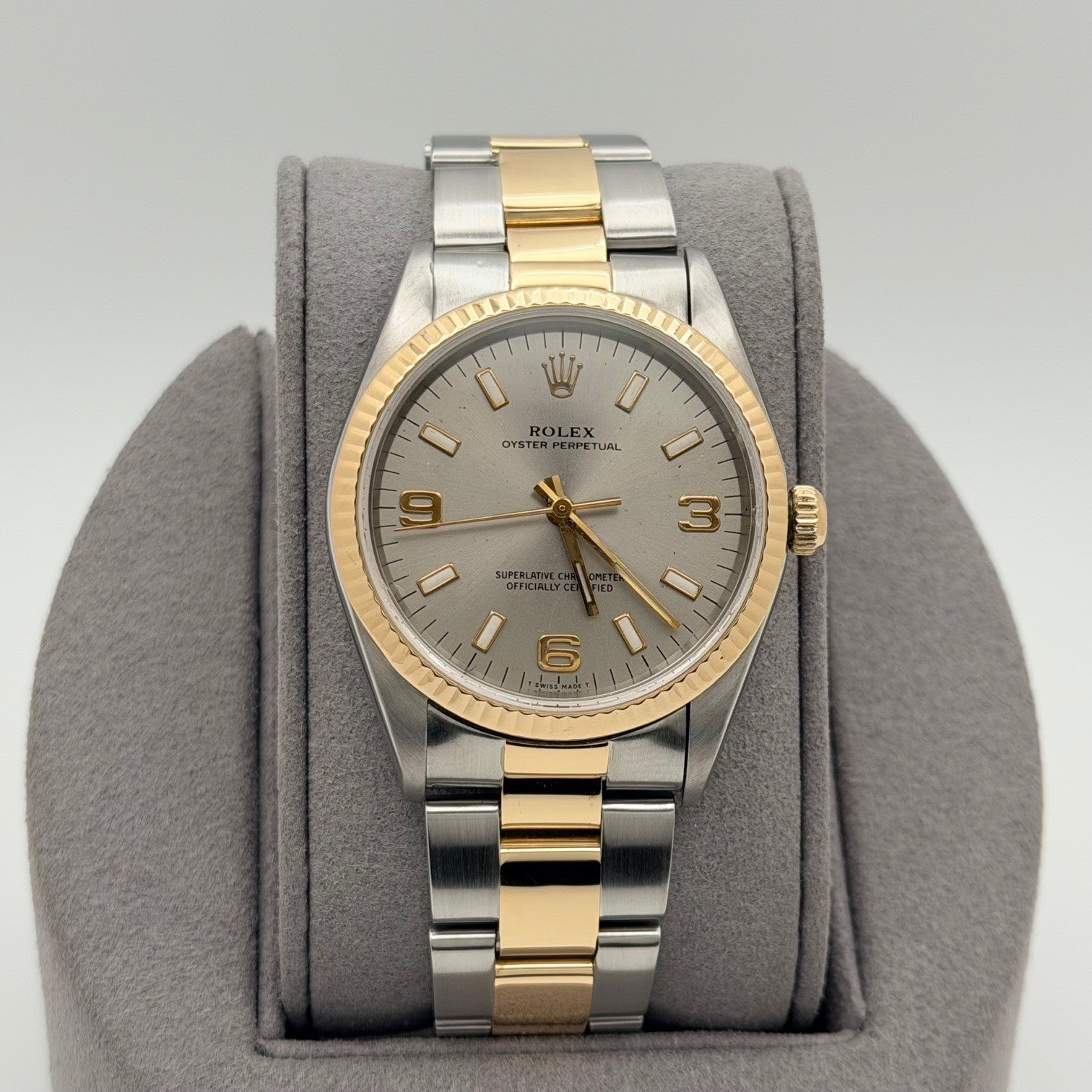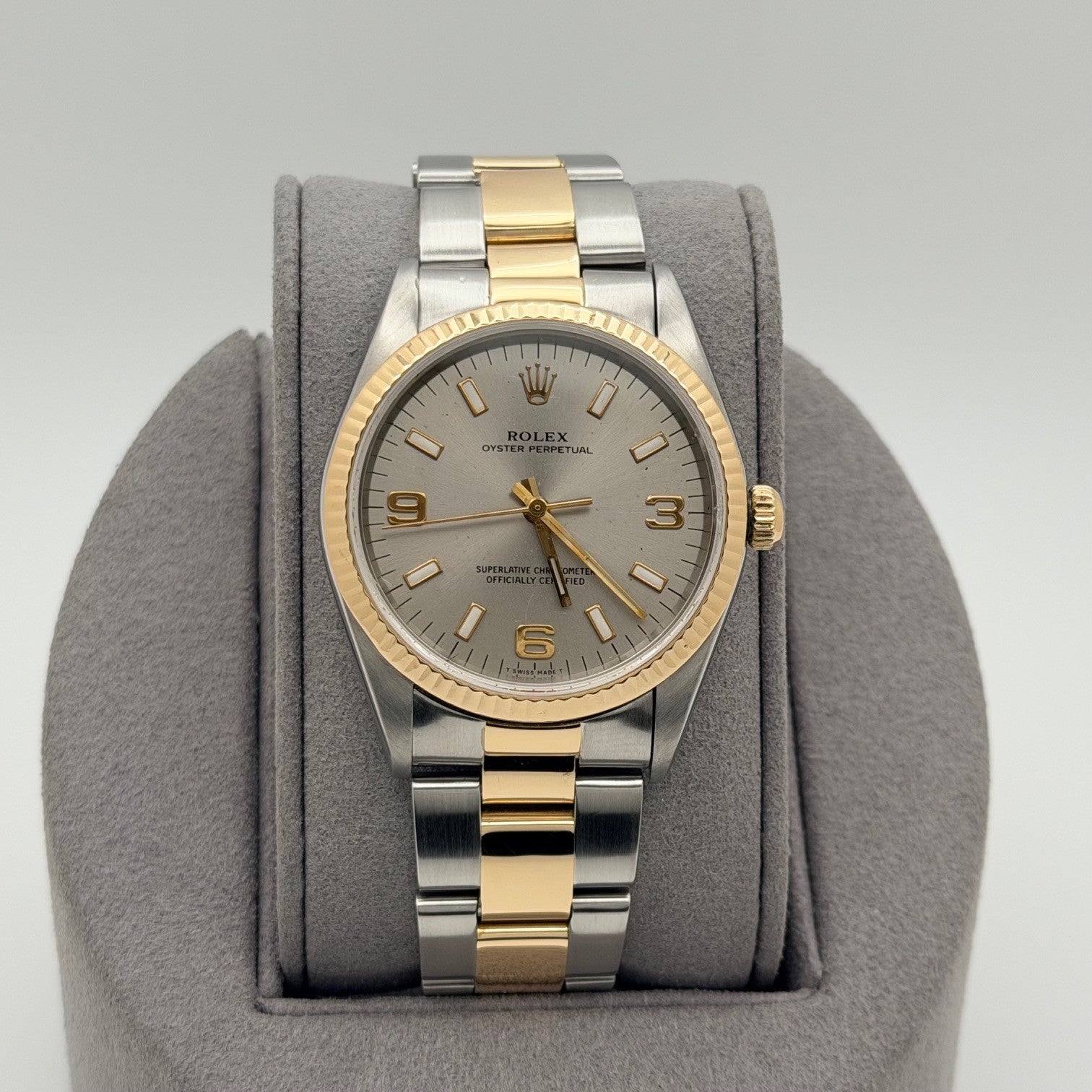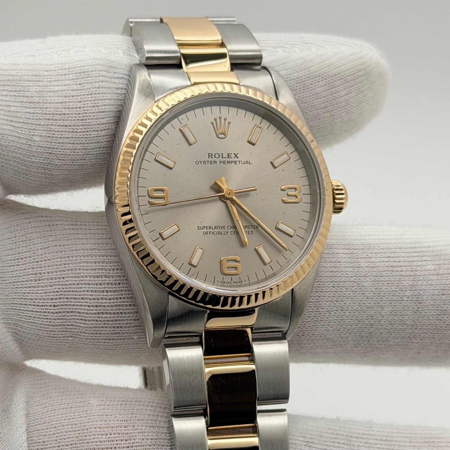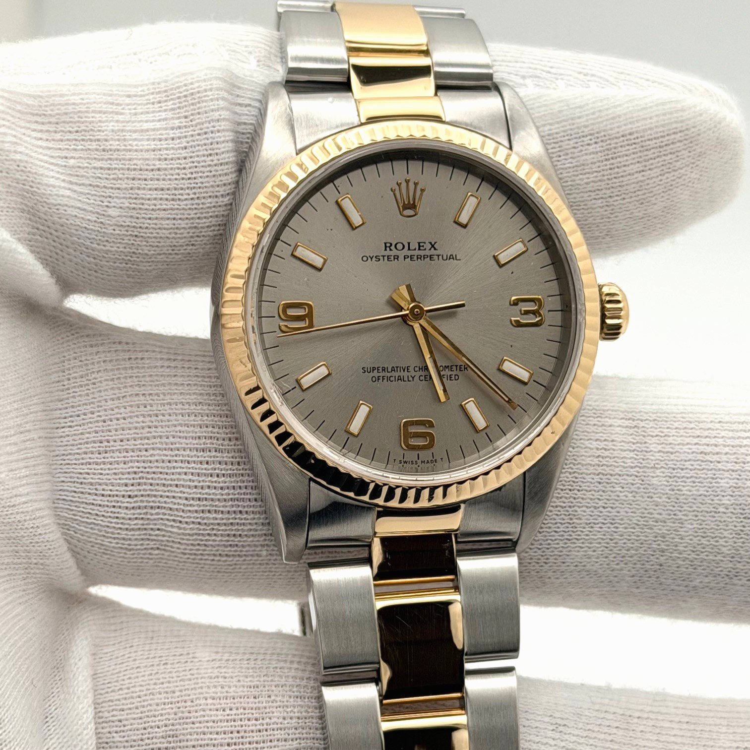 Rolex Oyster Perpetual 14233 34mm Silver Dial 18k Yellow Gold Stainless Steel Rolex Sale! from 589500 /per This item is a recurring or deferred purchase. By continuing, I agree to the cancellation policy and authorize you to charge my payment method at the prices, frequency and dates listed on this page until my order is fulfilled or I cancel, if permitted. +1 (619) 232-1273 This item is currently on backorder but you can still purchase it now and we'll ship as soon as more become available. Style Number: 14233Serial: W89****Year: 1995 Model: Rolex Oyster Perpetual Case Material: Stainless Steel Band: 18k Yellow Gold & Stainless Steel Bezel: 18k Yellow Gold Fluted Dial: Silver Dial. dial has some wear Crystal: Sapphire Case Size: 34mm Includes: - Elegant Watch Box- Certified Appraisal - 1 Year WarrantySKU 23493 / 17845TSD122625