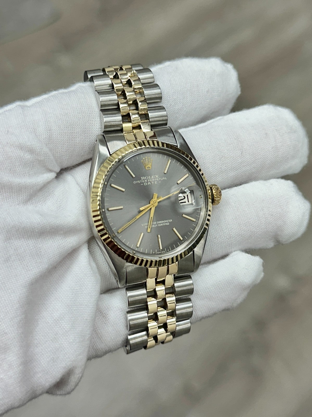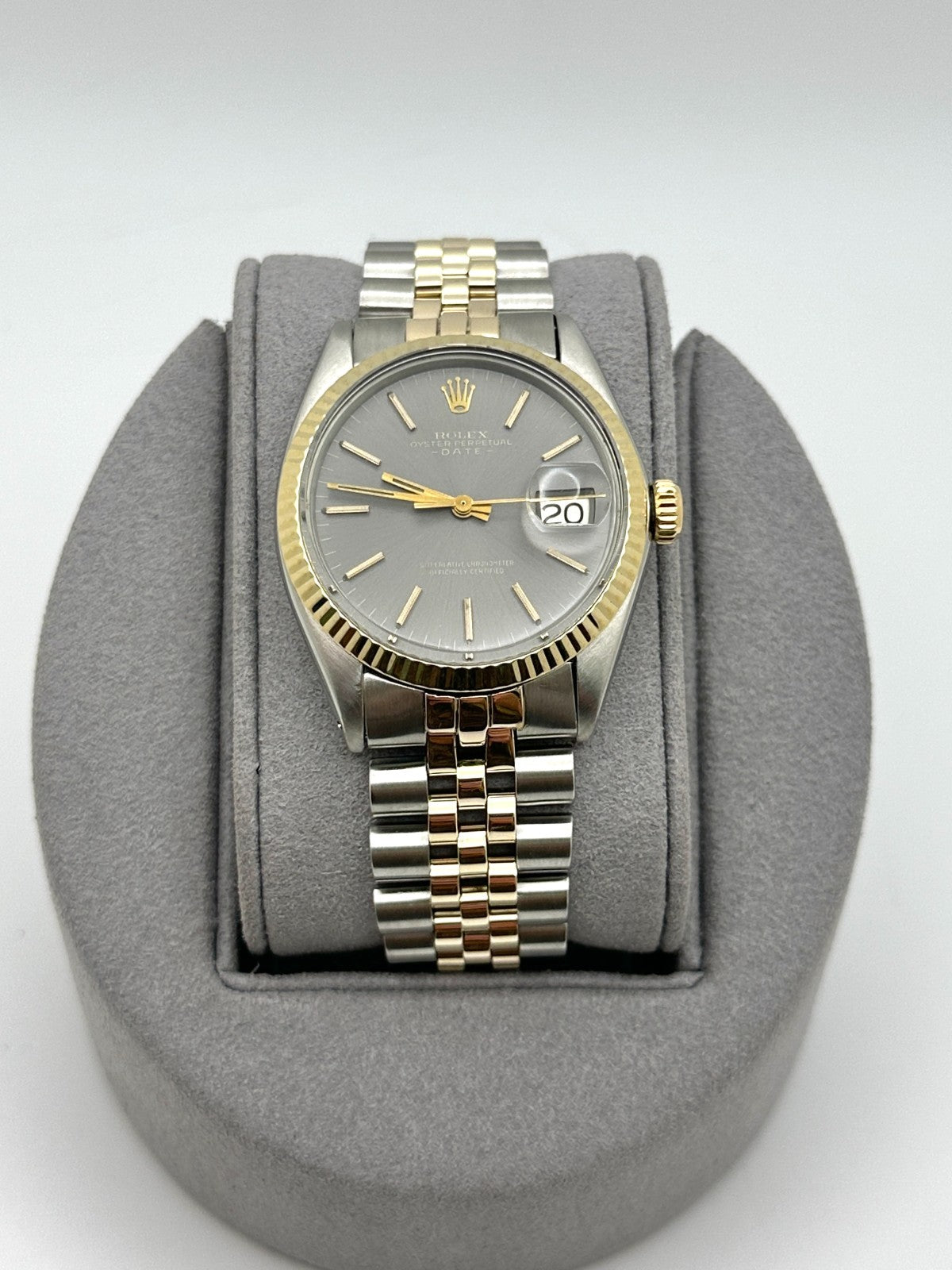 Rolex Oyster Perpetual Date 1500 34mm Gray Dial 14K Yellow Gold Stainless Steel Rolex Sale! from 499500 /per This item is a recurring or deferred purchase. By continuing, I agree to the cancellation policy and authorize you to charge my payment method at the prices, frequency and dates listed on this page until my order is fulfilled or I cancel, if permitted. +1 (619) 232-1273 This item is currently on backorder but you can still purchase it now and we'll ship as soon as more become available. Style Number: 1500Serial: 2351***Year: 1970 Model: Rolex Oyster Perpetual Date Case Material: Stainless Steel Band: Custom 14K Yellow Gold & Stainless Steel Bezel: 14K Yellow Gold Dial: Gray Crystal: Acrylic Case Size: 34mm Includes: - Rolex Box & Paper- Certified Appraisal - One Year WarrantySKU 21479 / 13810TGCORE071924