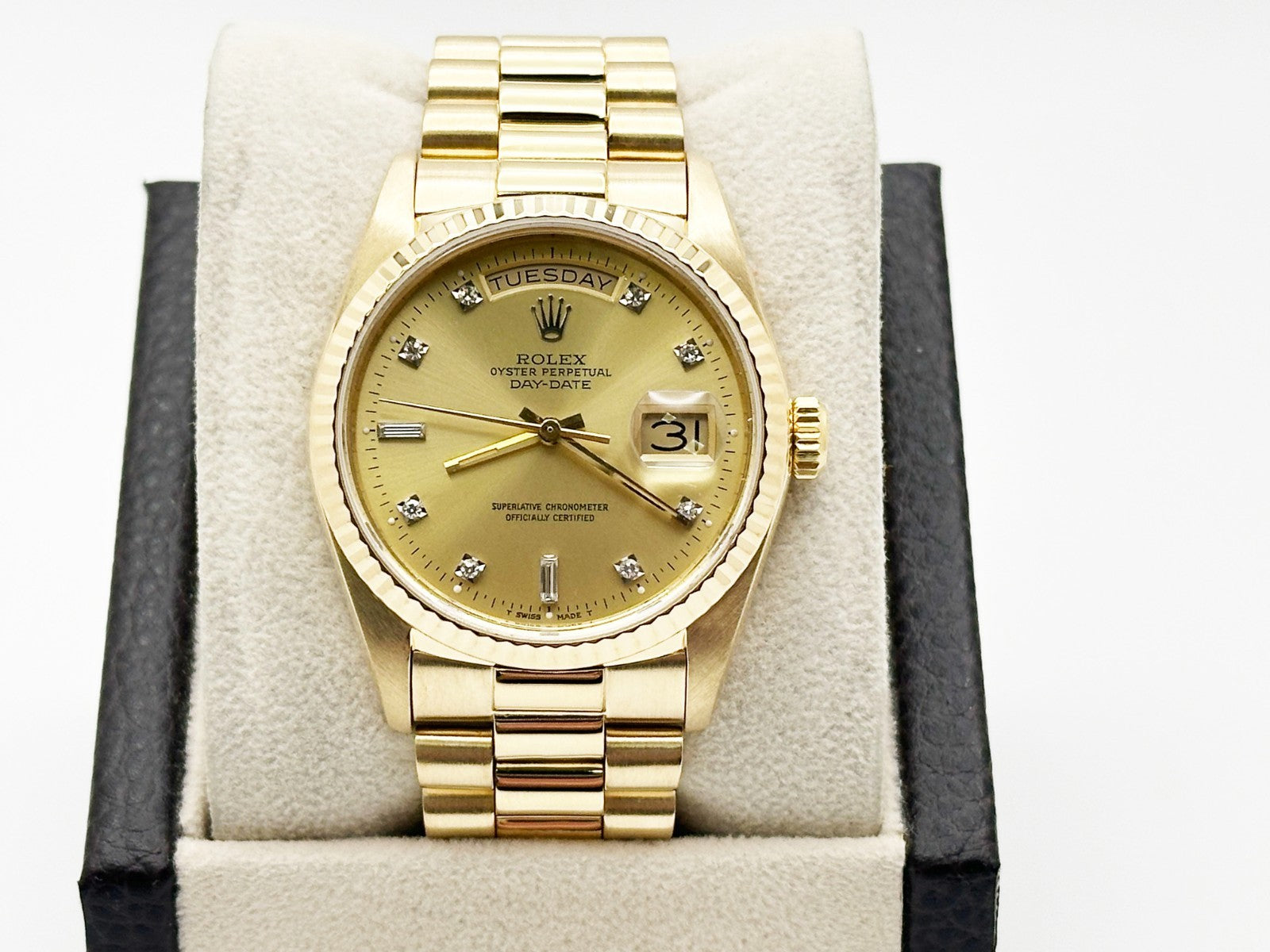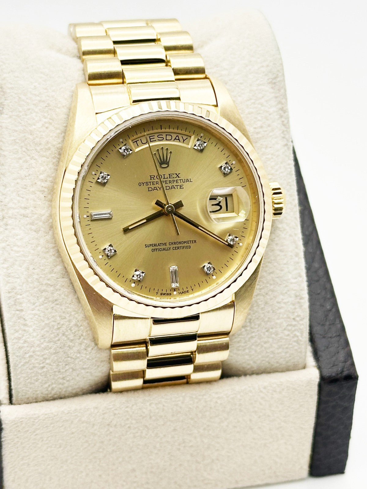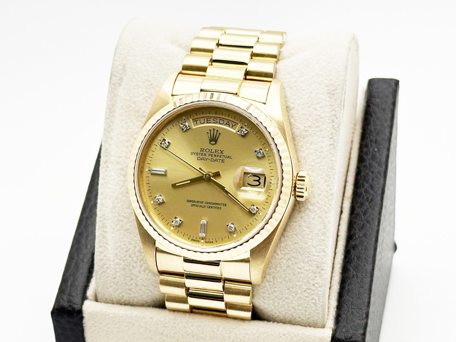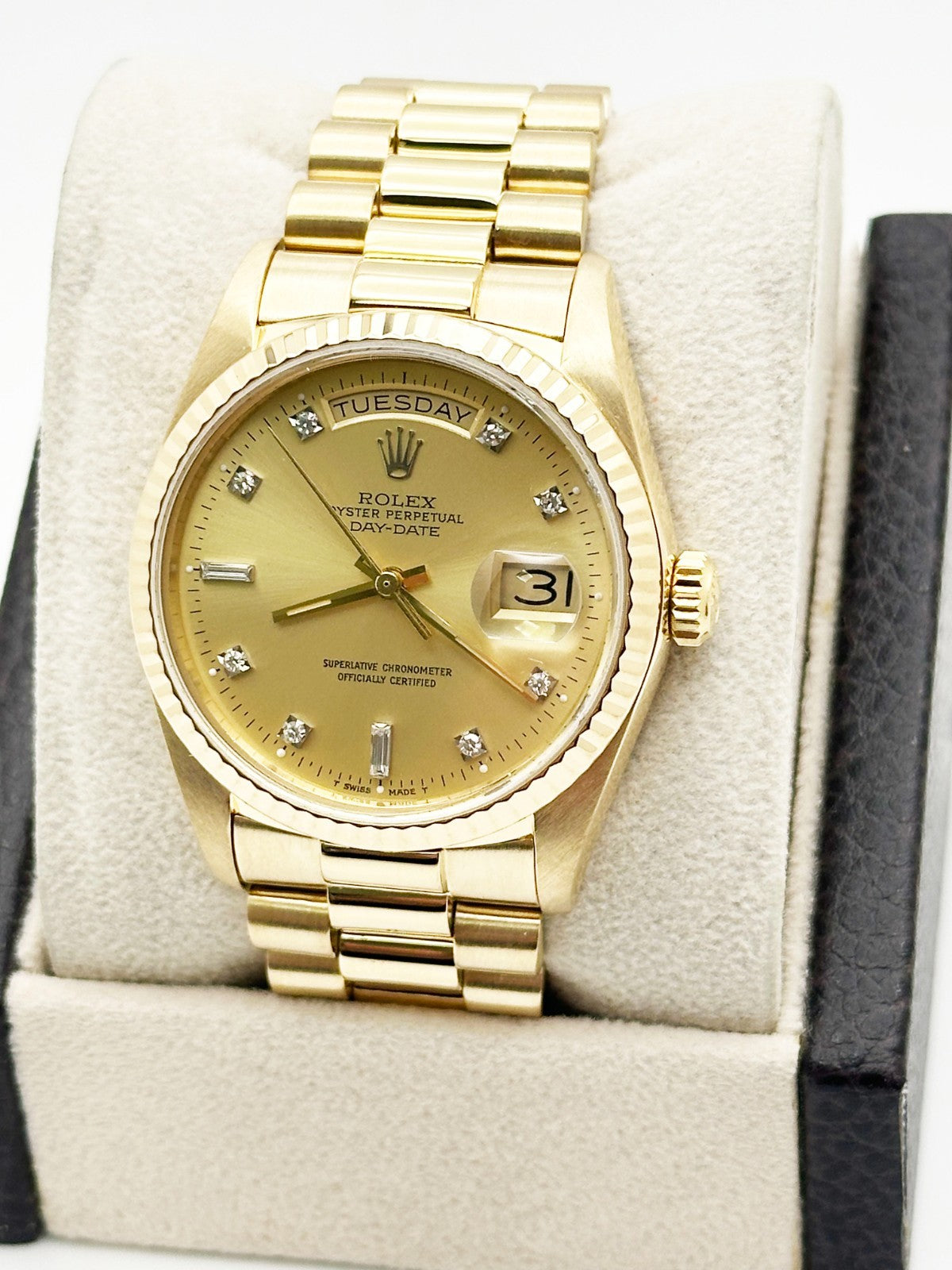 Rolex President Day Date 18038 36mm Champagne Diamond Dial 18K Yellow Gold Rolex Sale! from 1819500 /per This item is a recurring or deferred purchase. By continuing, I agree to the cancellation policy and authorize you to charge my payment method at the prices, frequency and dates listed on this page until my order is fulfilled or I cancel, if permitted. +1 (619) 232-1273 This item is currently on backorder but you can still purchase it now and we'll ship as soon as more become available. Style Number: 18038Serial: 8491***Year: 1984 Model: Rolex President Day Date Case Material: 18K Yellow Gold Band: 18K Yellow Gold Bezel: 18K Yellow Gold Fluted Dial: Factory Champagne Diamond Dial Face: Sapphire Crystal Case Size: 36mm Includes: -Elegant Watch Box-Certified Appraisal -1 Year WarrantySKU 22644 / 138130TJD061225