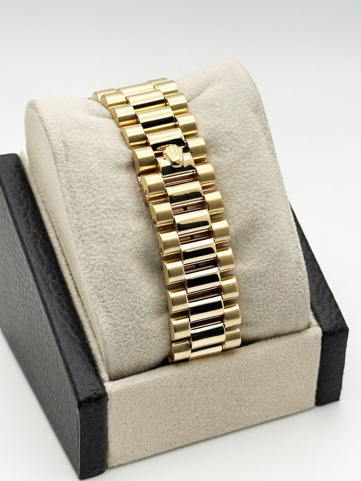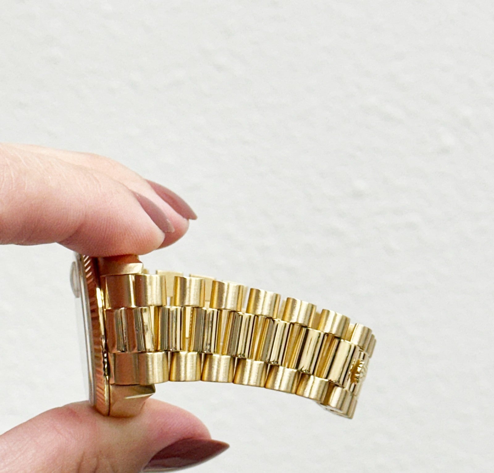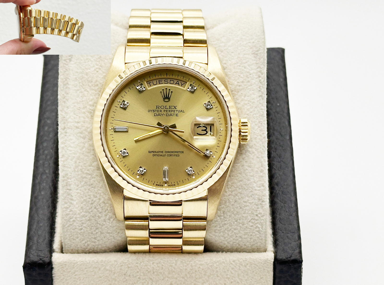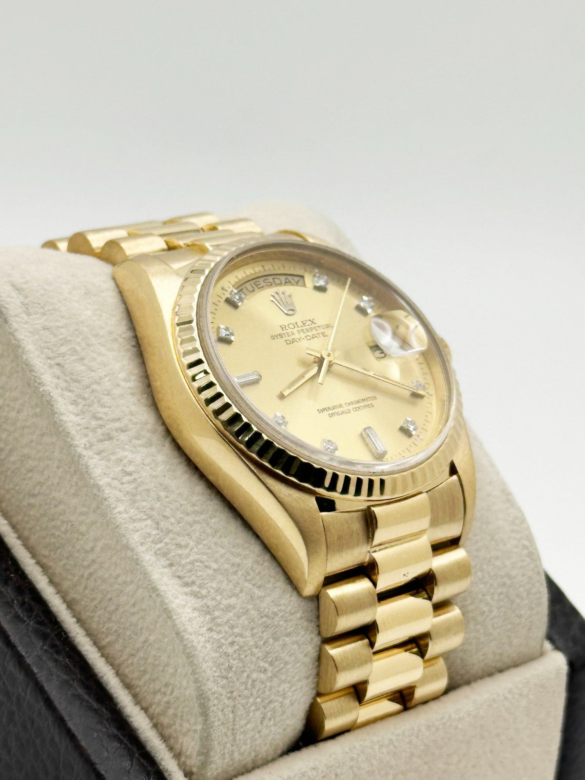 Rolex President Day Date 18038 36mm Champagne Diamond Dial 18K Yellow Gold Rolex Sale! from 1819500 /per This item is a recurring or deferred purchase. By continuing, I agree to the cancellation policy and authorize you to charge my payment method at the prices, frequency and dates listed on this page until my order is fulfilled or I cancel, if permitted. +1 (619) 232-1273 This item is currently on backorder but you can still purchase it now and we'll ship as soon as more become available. Style Number: 18038Serial: 8491***Year: 1984 Model: Rolex President Day Date Case Material: 18K Yellow Gold Band: 18K Yellow Gold Bezel: 18K Yellow Gold Fluted Dial: Factory Champagne Diamond Dial Face: Sapphire Crystal Case Size: 36mm Includes: -Elegant Watch Box-Certified Appraisal -1 Year WarrantySKU 22644 / 138130TJD061225