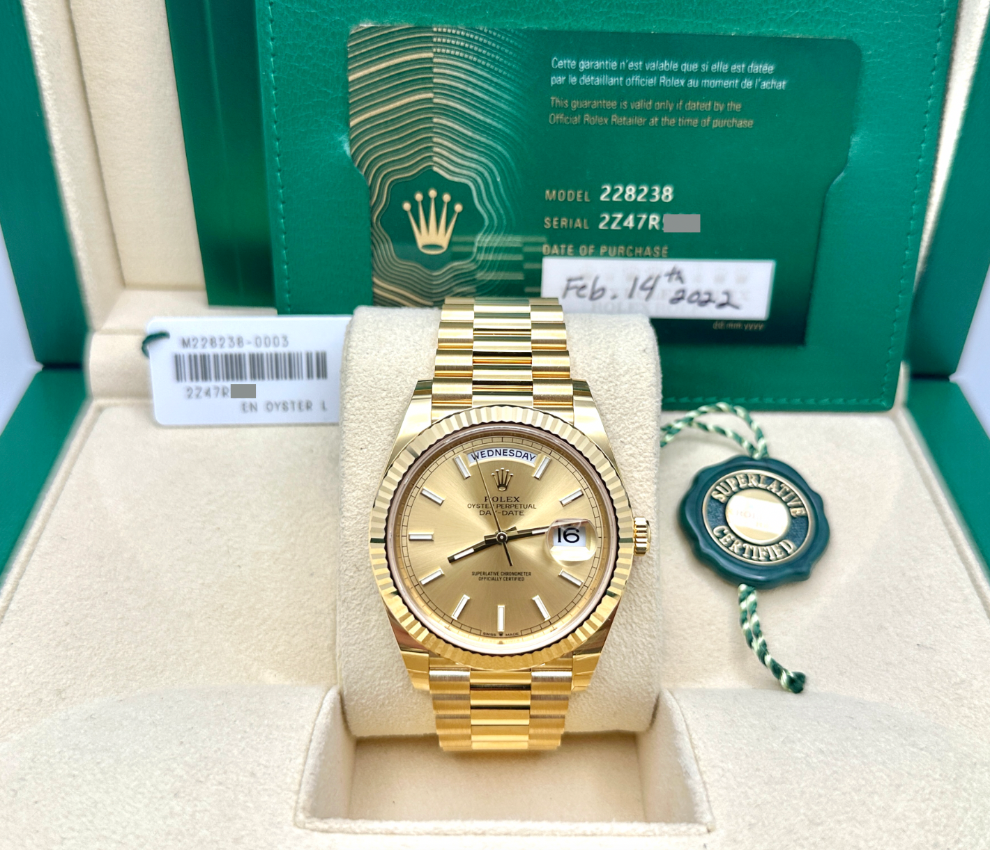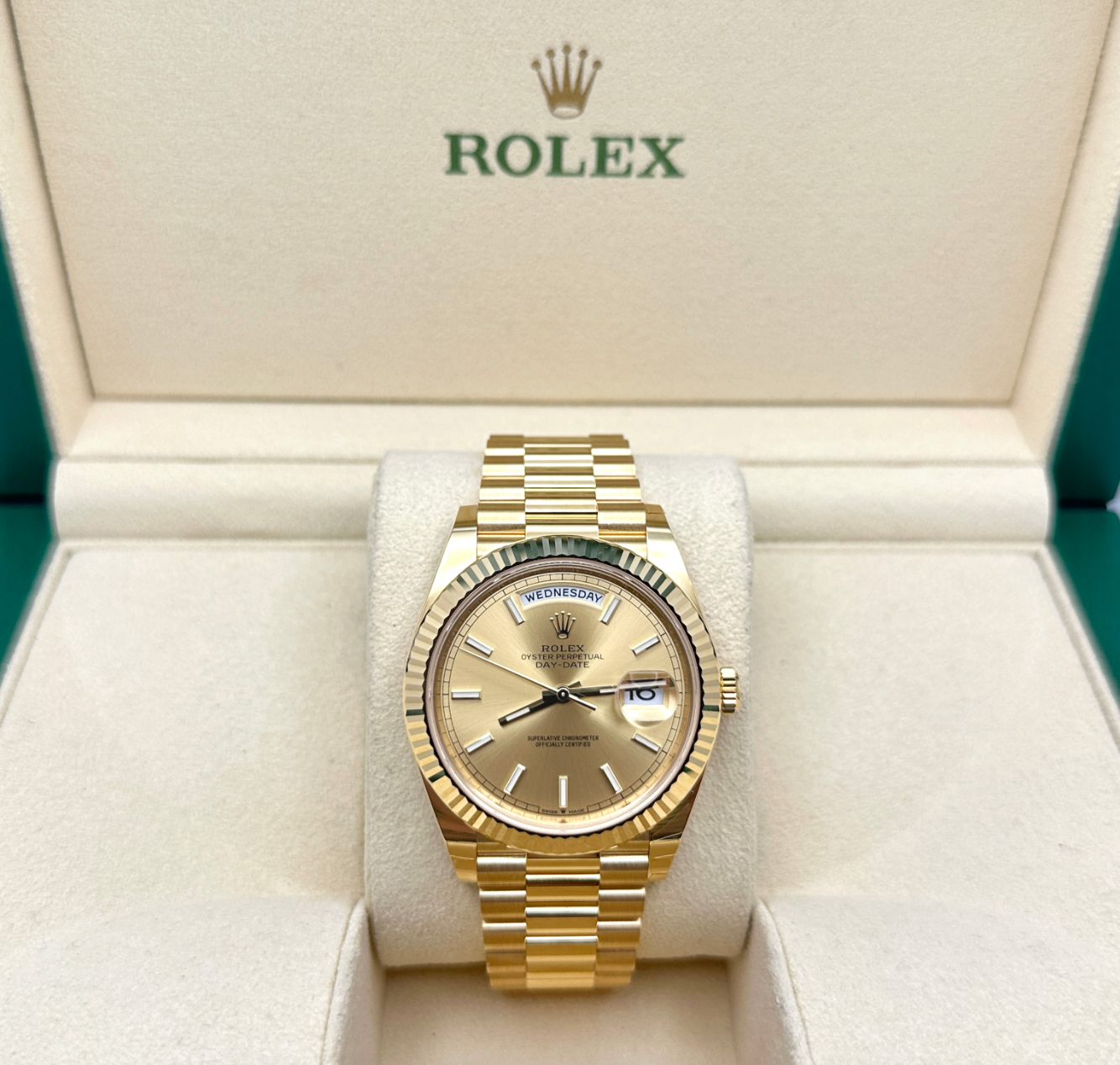 Rolex President Day Date 228238 40mm Champagne Dial 18K Yellow Gold Box Papers Rolex Sale! from 4549500 /per This item is a recurring or deferred purchase. By continuing, I agree to the cancellation policy and authorize you to charge my payment method at the prices, frequency and dates listed on this page until my order is fulfilled or I cancel, if permitted. +1 (619) 232-1273 This item is currently on backorder but you can still purchase it now and we'll ship as soon as more become available. Style Number: 228238Serial: 2Z47R***Year: 2022 Model: Rolex President Day-Date Case Material: 18K Yellow Gold Band: 18K Yellow Gold Bezel: 18K Yellow Gold Dial: Champagne Crystal: Sapphire Crystal Case Size: 40mm Includes: - Rolex Box & Paper- Certified Appraisal - One Year WarrantySKU 23721 / 1119175TBB020826