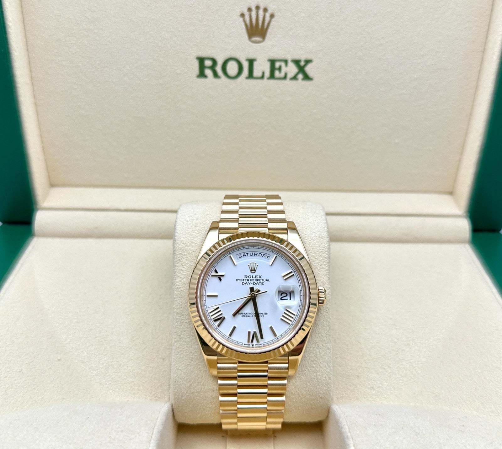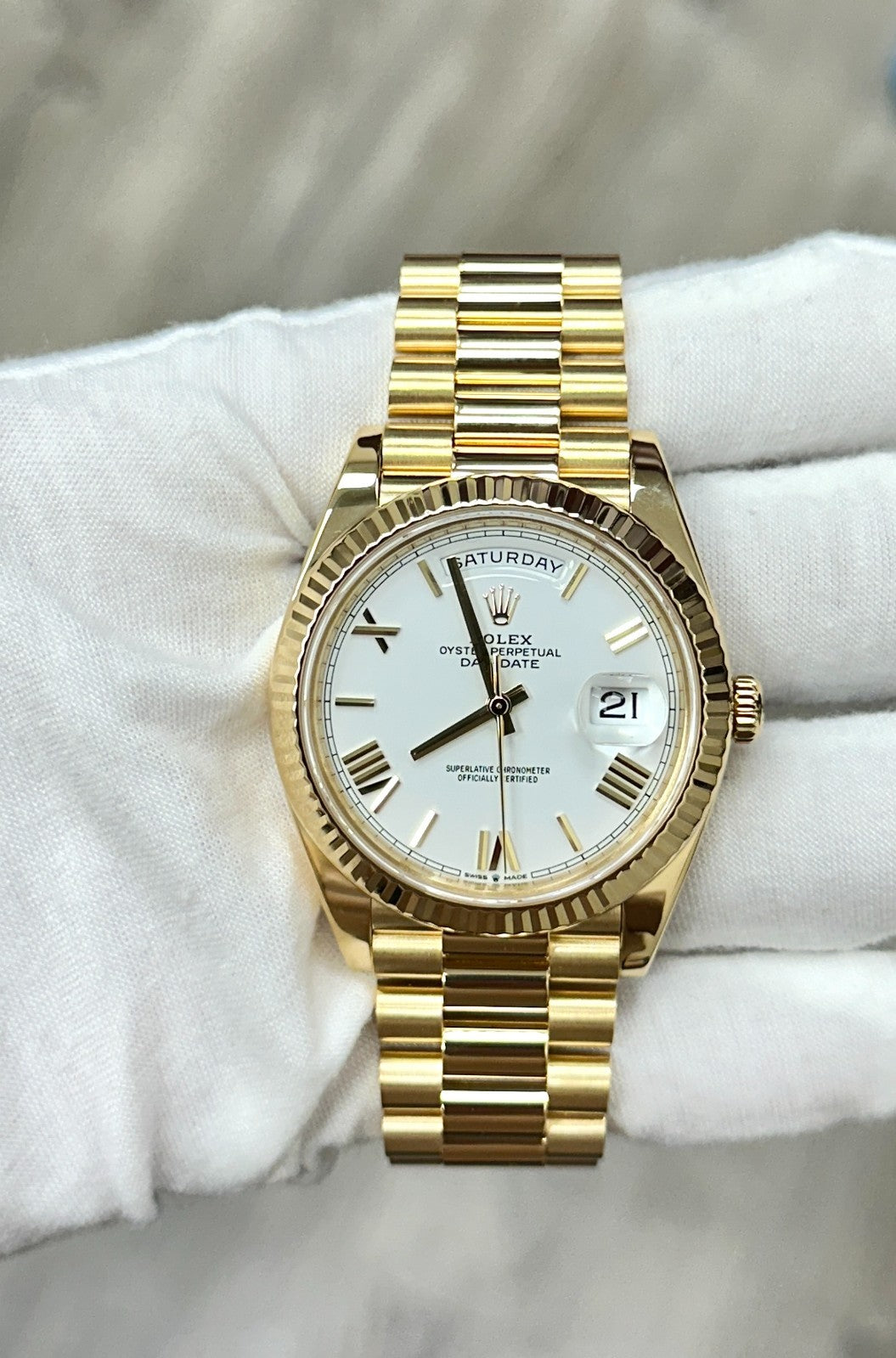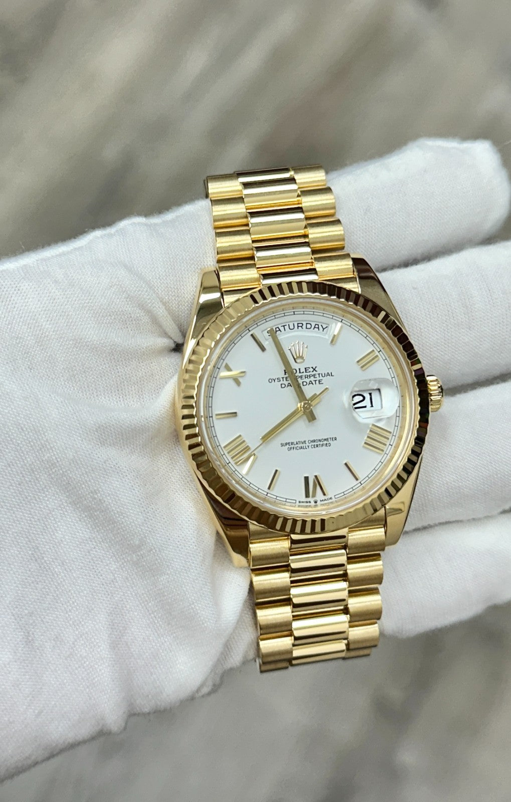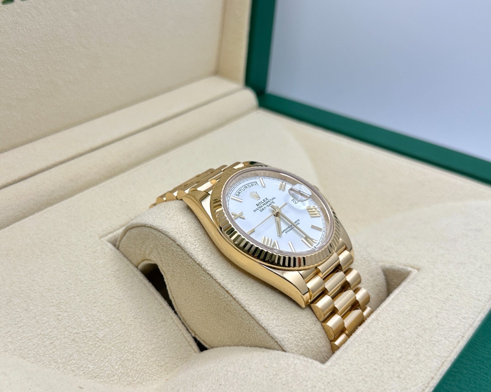 Rolex President Day Date 228238 40mm White Roman Dial 18K Yellow Gold Rolex Sale! from 4249500 /per This item is a recurring or deferred purchase. By continuing, I agree to the cancellation policy and authorize you to charge my payment method at the prices, frequency and dates listed on this page until my order is fulfilled or I cancel, if permitted. +1 (619) 232-1273 This item is currently on backorder but you can still purchase it now and we'll ship as soon as more become available. Style Number: 228238Serial: 168KJ***Model: Rolex President Day-Date Case Material: 18K Yellow Gold Band: 18K Yellow Gold Bezel: 18K Yellow Gold Dial: White Roman Dial Crystal: Sapphire Crystal Case Size: 40mm Includes: - Rolex Box - Certified Appraisal - One Year WarrantySKU 21951 / 199300TBJ121921