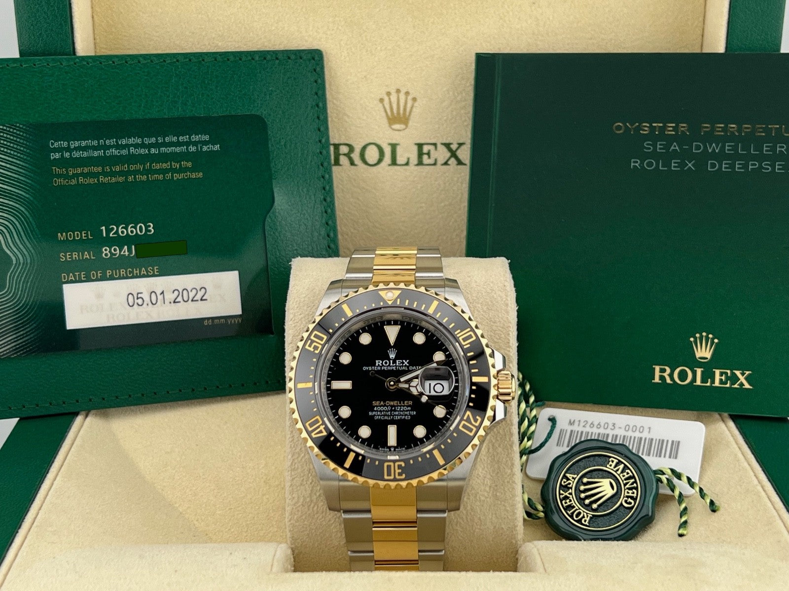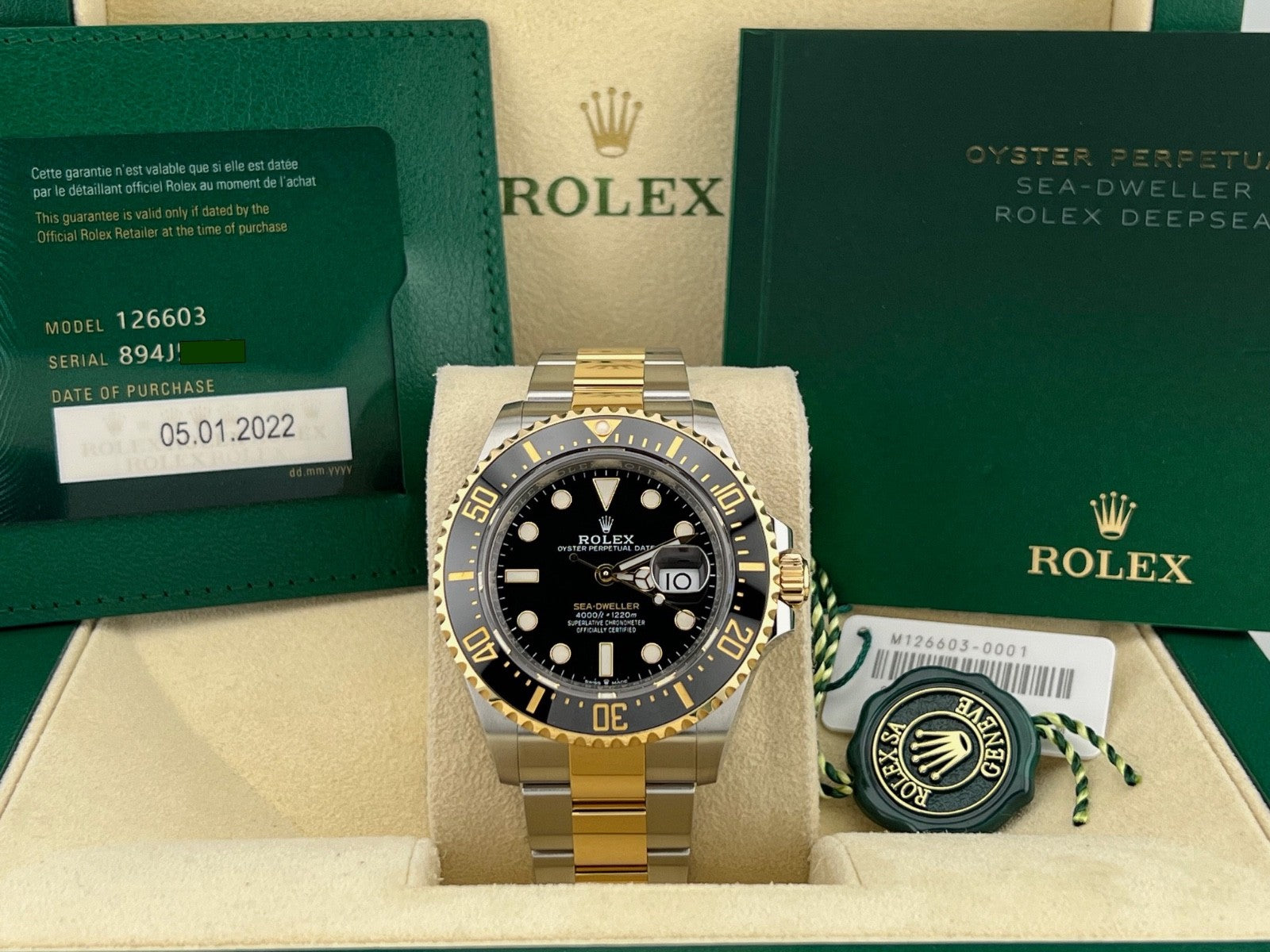 Rolex Sea Dweller 126603 43mm Black Dial 18k Yellow Gold Steel Box Papers 2022 Rolex Sale! from 1739500 /per This item is a recurring or deferred purchase. By continuing, I agree to the cancellation policy and authorize you to charge my payment method at the prices, frequency and dates listed on this page until my order is fulfilled or I cancel, if permitted. +1 (619) 232-1273 This item is currently on backorder but you can still purchase it now and we'll ship as soon as more become available. Style Number: 126603Serial: 894J****Year: 2022 Model: Rolex Sea Dweller Case Material: Stainless Steel Band: 18k Yellow Gold & Stainless Steel Bezel: Black Ceramic Dial: Black Crystal: Sapphire Case Size: 43mm Includes: - Rolex Box & Paper- Certified Appraisal - Five Year Factory Warranty from Original Purchase DateSKU 23007 / 141325T090525