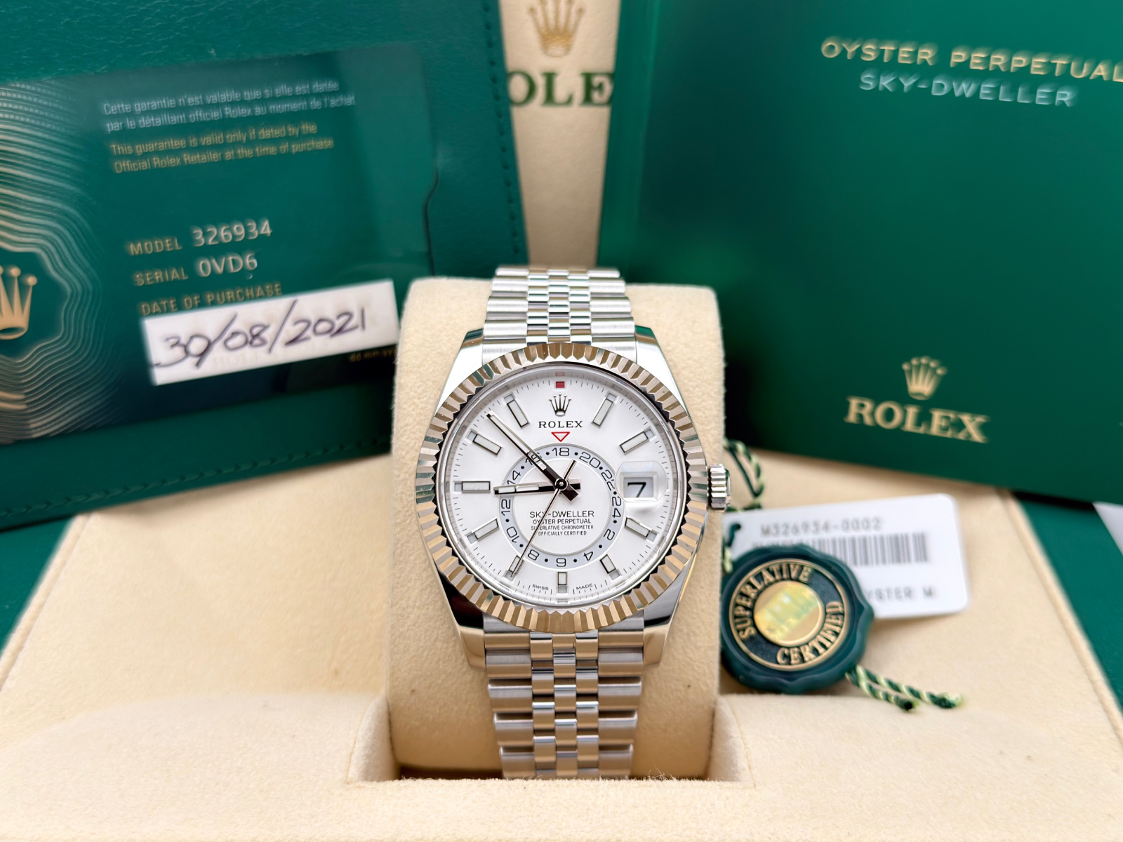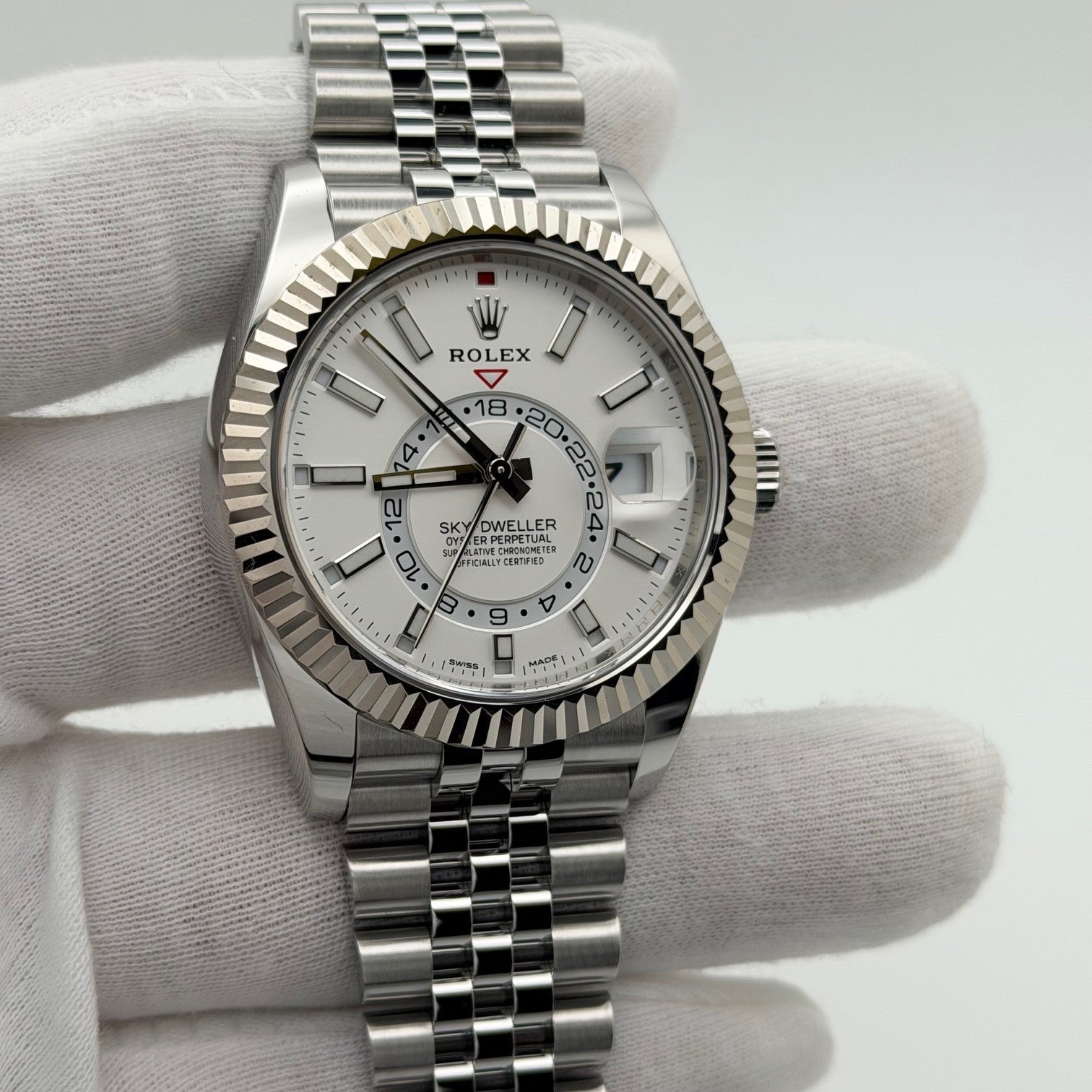 Rolex Sky Dweller 326934 42mm White Dial Jubilee Stainless Steel Box Paper Rolex Sale! from 2199500 /per This item is a recurring or deferred purchase. By continuing, I agree to the cancellation policy and authorize you to charge my payment method at the prices, frequency and dates listed on this page until my order is fulfilled or I cancel, if permitted. +1 (619) 232-1273 This item is currently on backorder but you can still purchase it now and we'll ship as soon as more become available. Style Number: 326934Serial: 0VD6****Year: 2021 Model: Rolex Sky Dweller Case Material: Stainless Steel Band: Stainless Steel Jubilee Bezel: 18k White Gold Fluted Dial: White Dial Crystal: Sapphire Case Size: 42mm Includes: - Rolex Box & Paper- Certified Appraisal - 1 Year WarrantySKU 23441 / 155725TBB121025