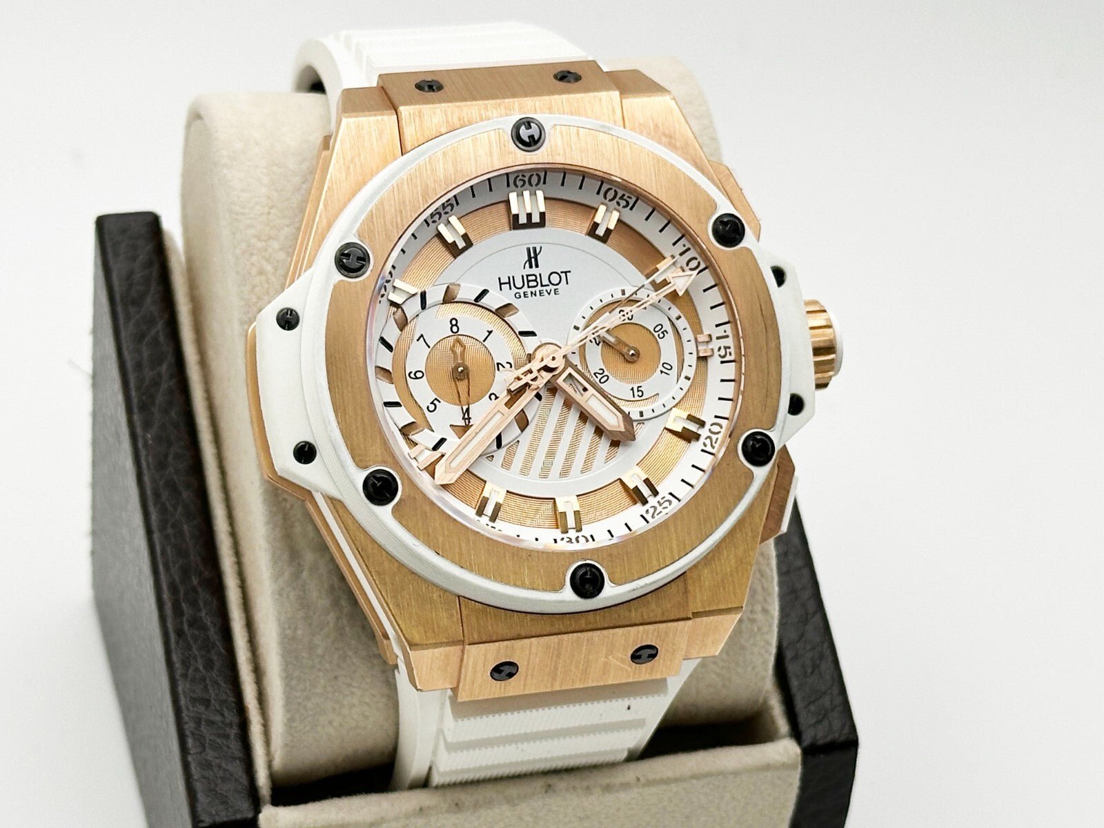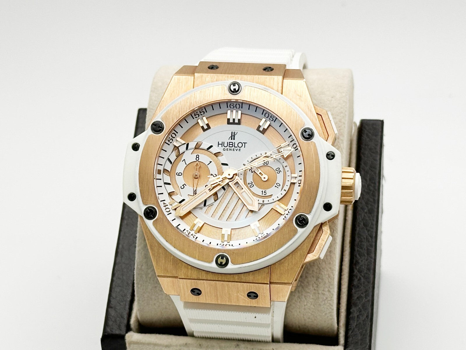 Style Number: 715.OE.2118.RW Year: 2012 Model: Hublot Big Bang King Power Foudroyante Case Material: 18K Rose GoldWeight: 254 grams Band: White Rubber Bezel: 18K Rose Gold Dial: White Dial Face: Sapphire Crystal Case Size: 48mm Includes: -Hublot Box & Paper -Certified Appraisal -1 Year Warranty SKU 22386 / 141250TBJ041525