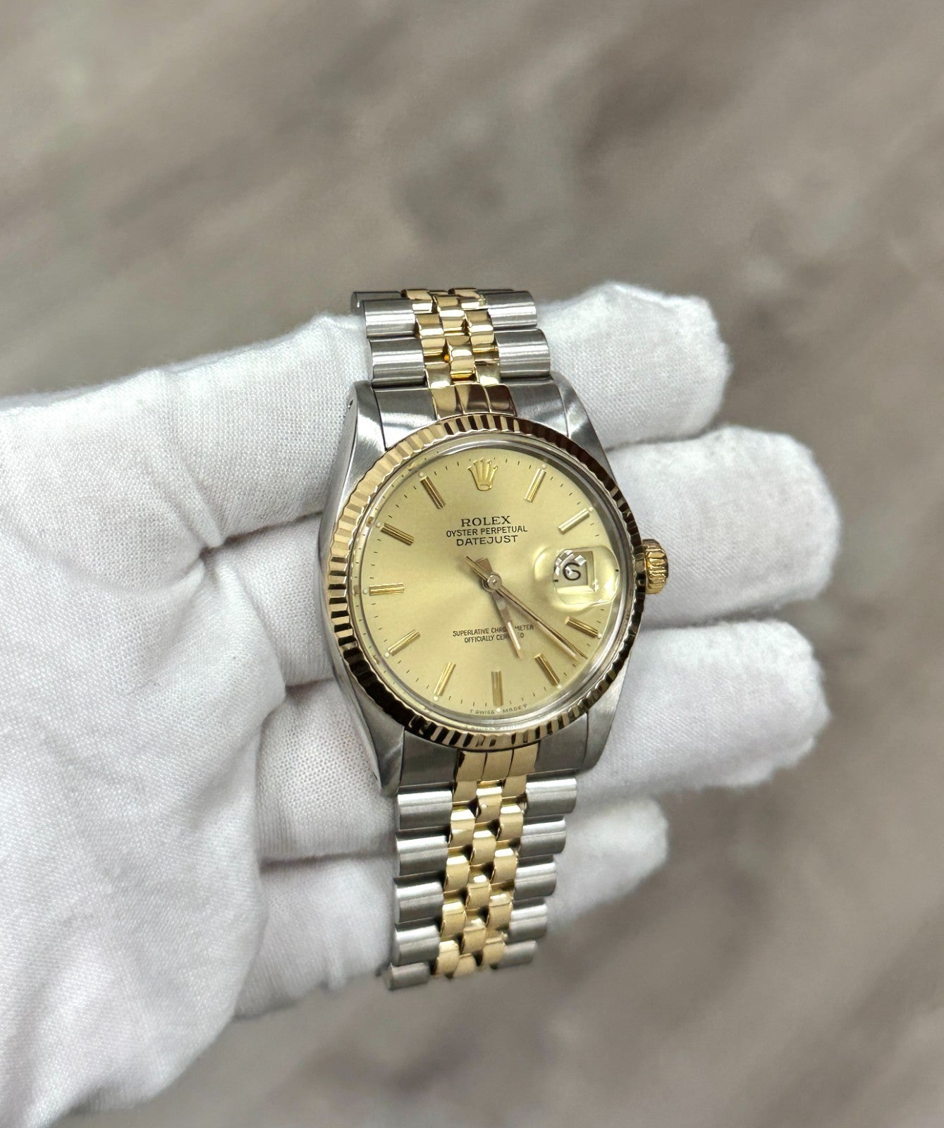 Rolex Datejust 16013 36mm Champagne Dial 18K Yellow Gold Steel Box Papers Rolex Sale! from 779500 /per This item is a recurring or deferred purchase. By continuing, I agree to the cancellation policy and authorize you to charge my payment method at the prices, frequency and dates listed on this page until my order is fulfilled or I cancel, if permitted. +1 (619) 232-1273 This item is currently on backorder but you can still purchase it now and we'll ship as soon as more become available. Style Number: 16013Serial: 9284***Year: 1986 Model: Rolex Datejust Case Material: Stainless Steel Band: 18K Yellow Gold & Stainless Steel Bezel: 18K Yellow Gold Fluted Dial: Champagne Crystal: Acrylic Case Size: 36mm Includes: - Rolex Box & Papers- Certified Appraisal - One Year WarrantySKU 23450 / 111133TOC111925