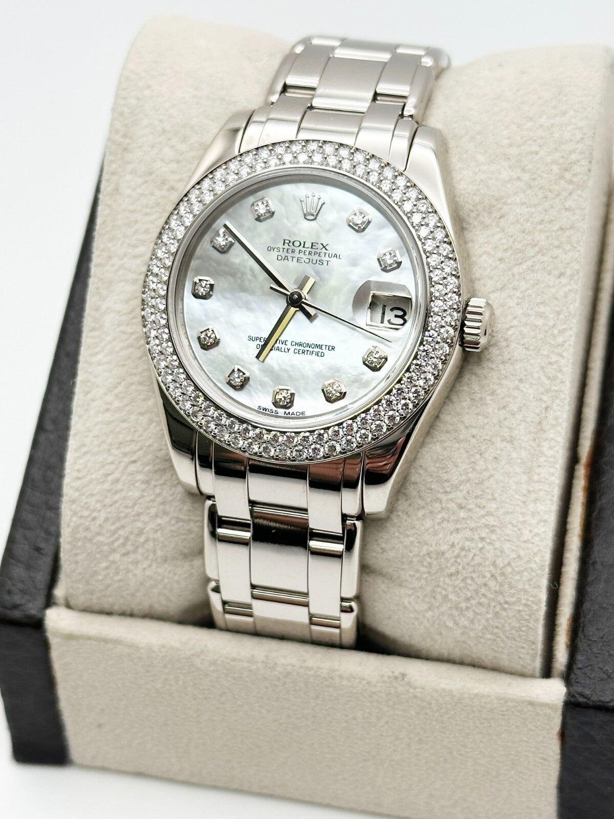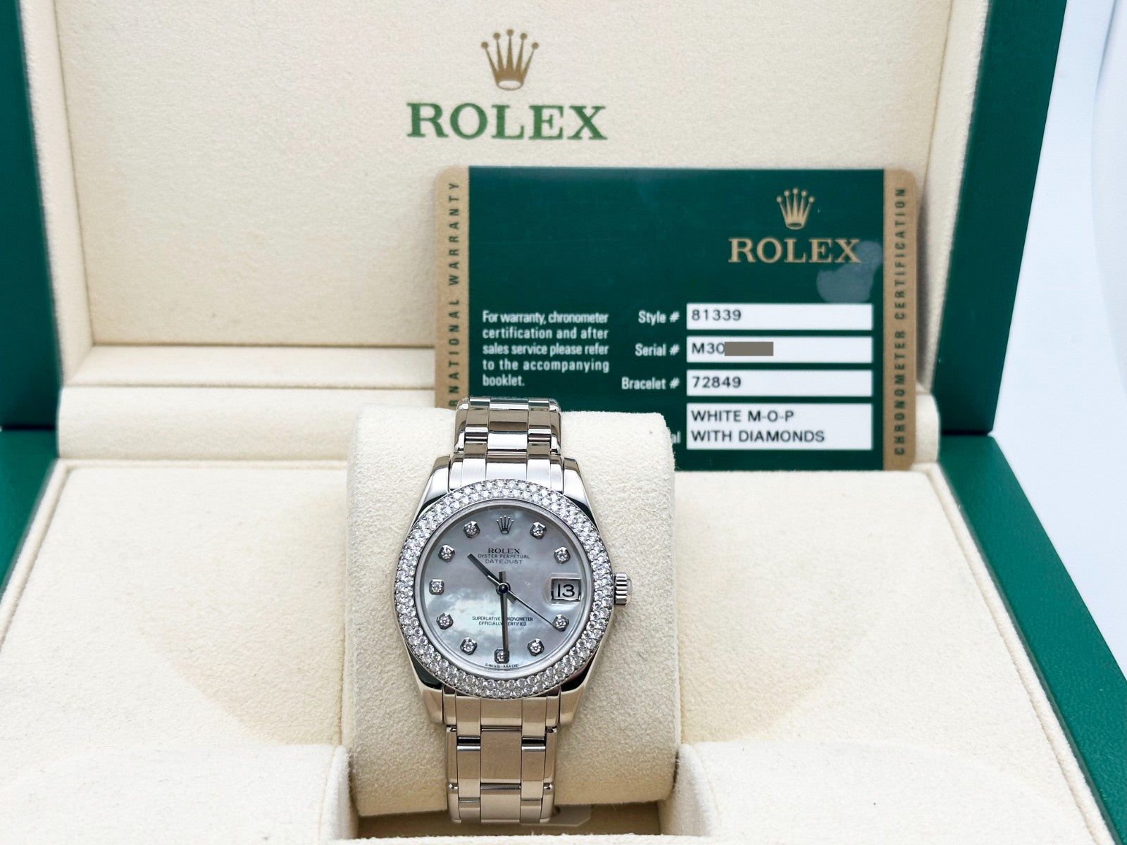 Rolex Pearlmaster 81339 34mm MOP Diamond Dial Diamond Bezel 18K White Gold B & P