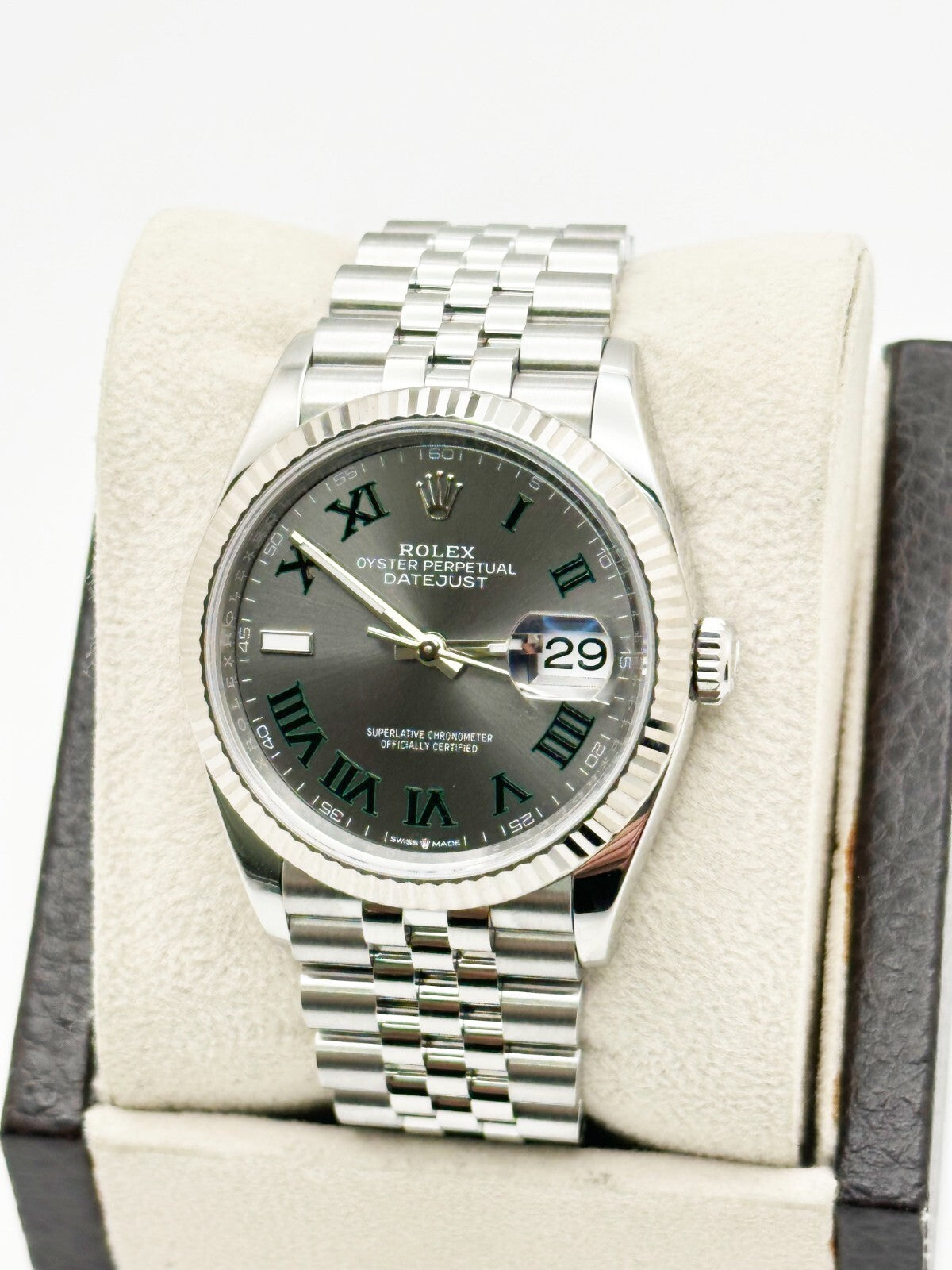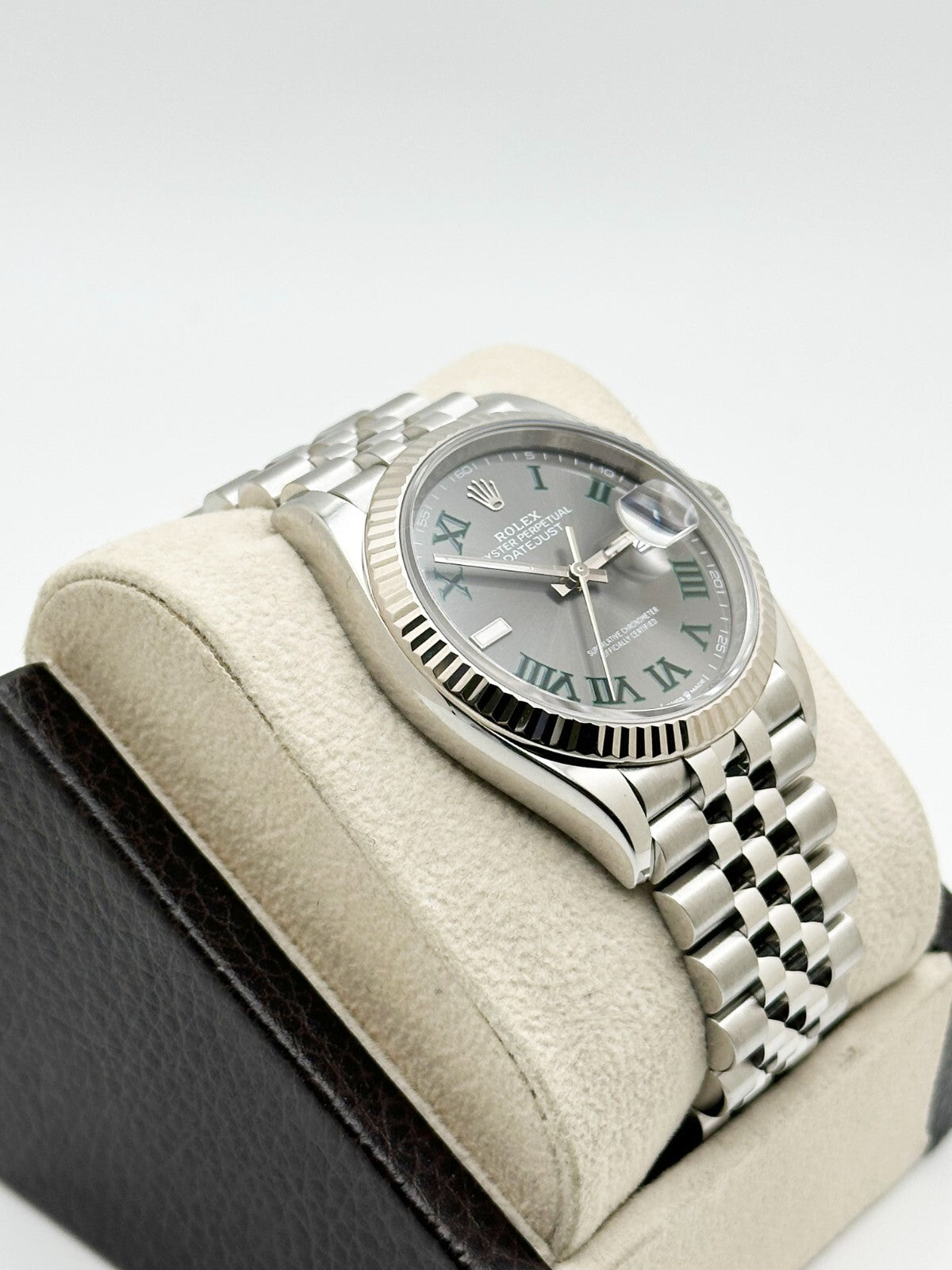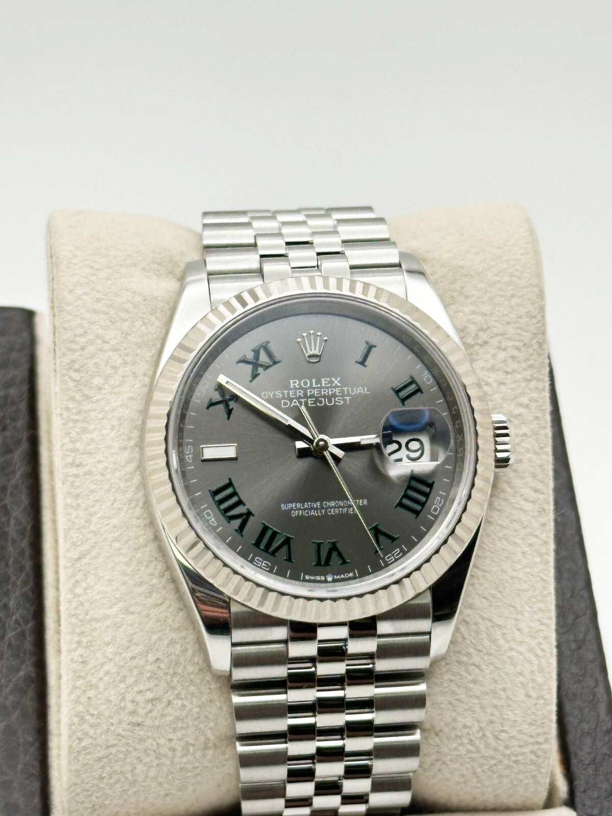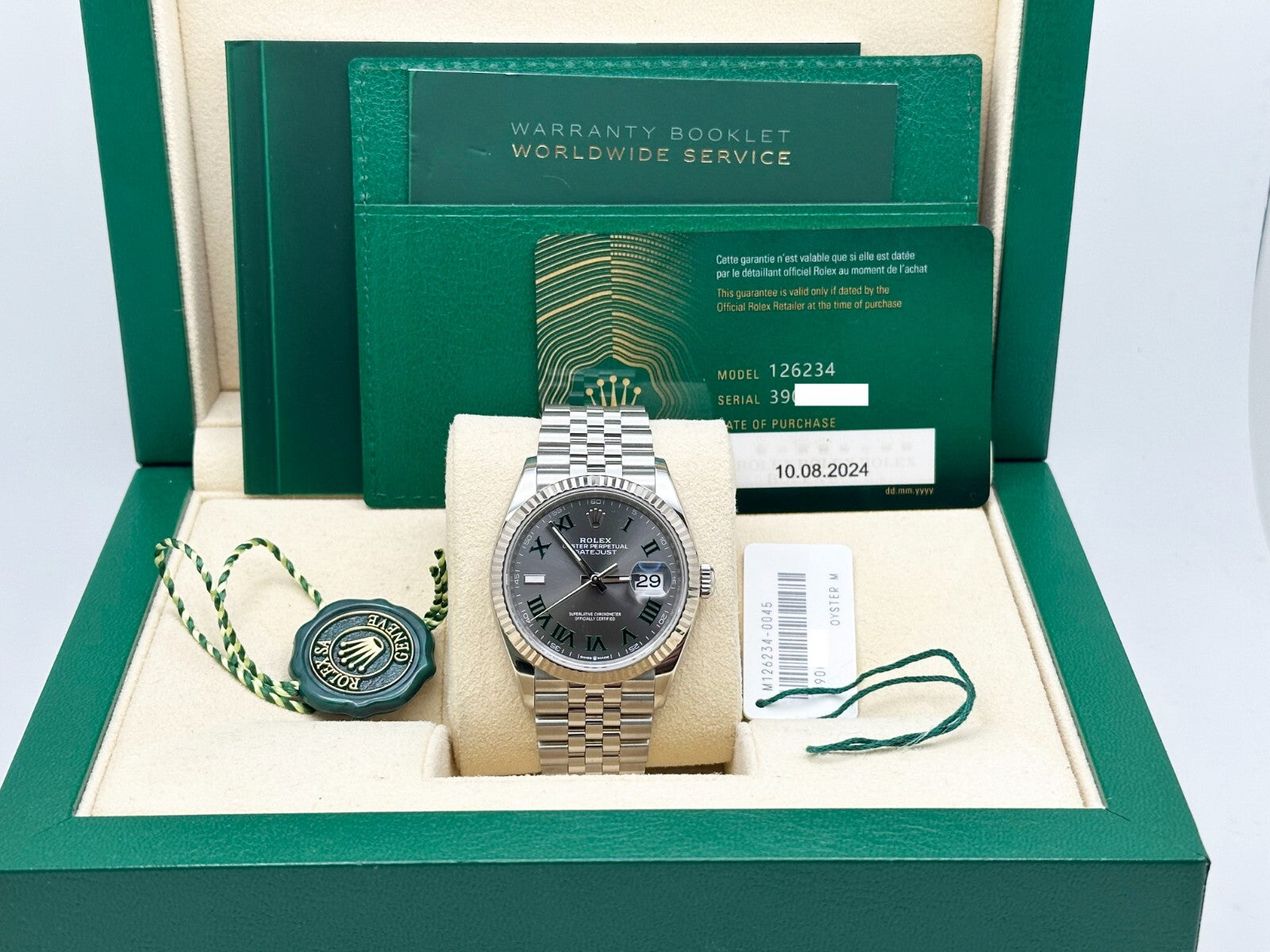 2024 Rolex Datejust 126234 36mm Slate Wimbledon Dial Steel Jubilee Box Paper Rolex Sale! from 1369500 /per This item is a recurring or deferred purchase. By continuing, I agree to the cancellation policy and authorize you to charge my payment method at the prices, frequency and dates listed on this page until my order is fulfilled or I cancel, if permitted. +1 (619) 232-1273 This item is currently on backorder but you can still purchase it now and we'll ship as soon as more become available. Style Number: 126234Serial: 39003***Year: 2024 Model: Rolex Datejust Case Material: Stainless Steel Band: Stainless Steel Jubilee Band Bezel: 18K White Gold Fluted Bezel Dial: Slate Wimbledon Face: Sapphire Crystal Case Size: 36mm Includes: -Rolex Box & Paper-Certified Appraisal -5 Year Factory Warranty from Original Purchase Date SKU 22605 / 130390TSTADEN052925