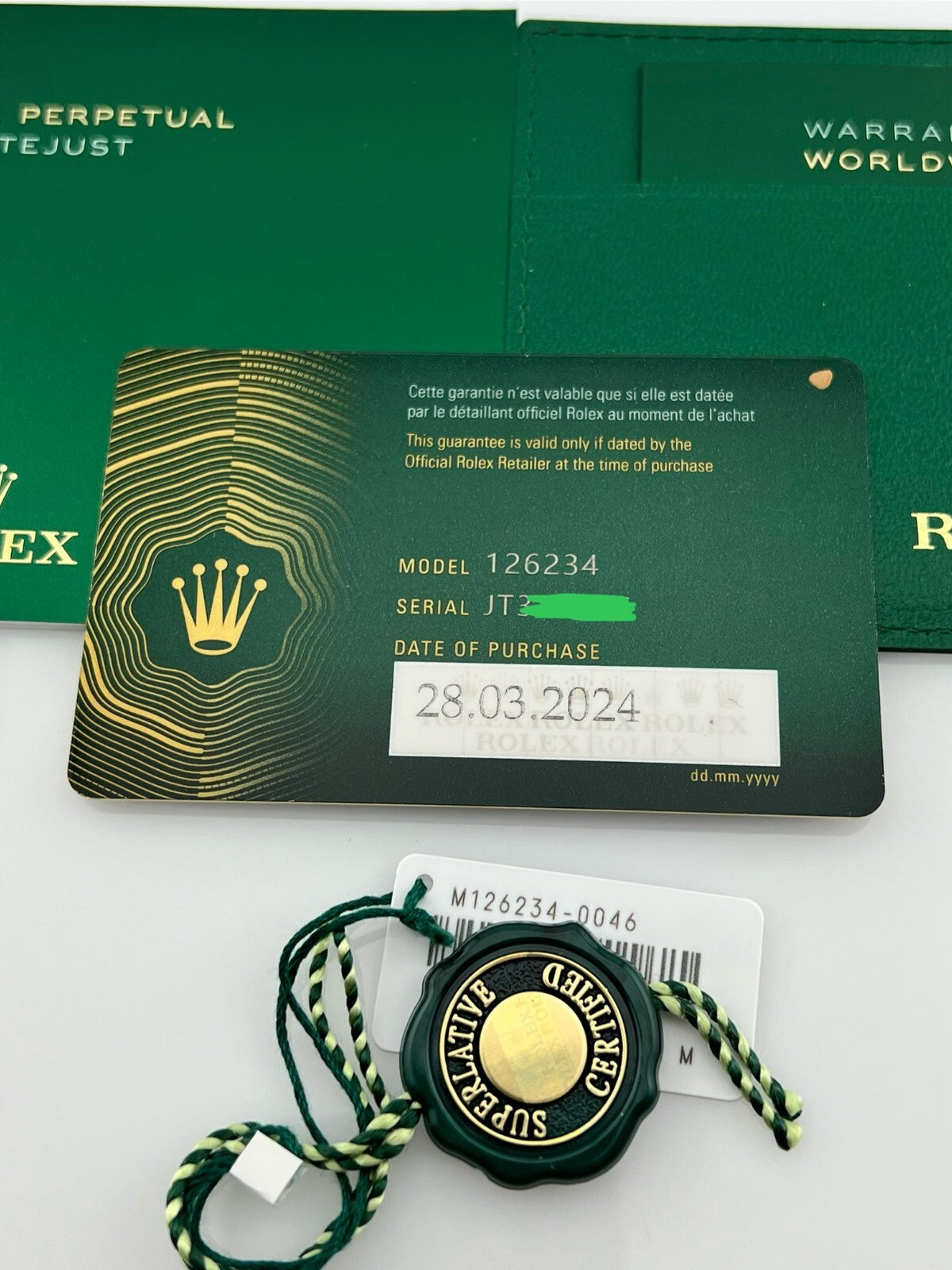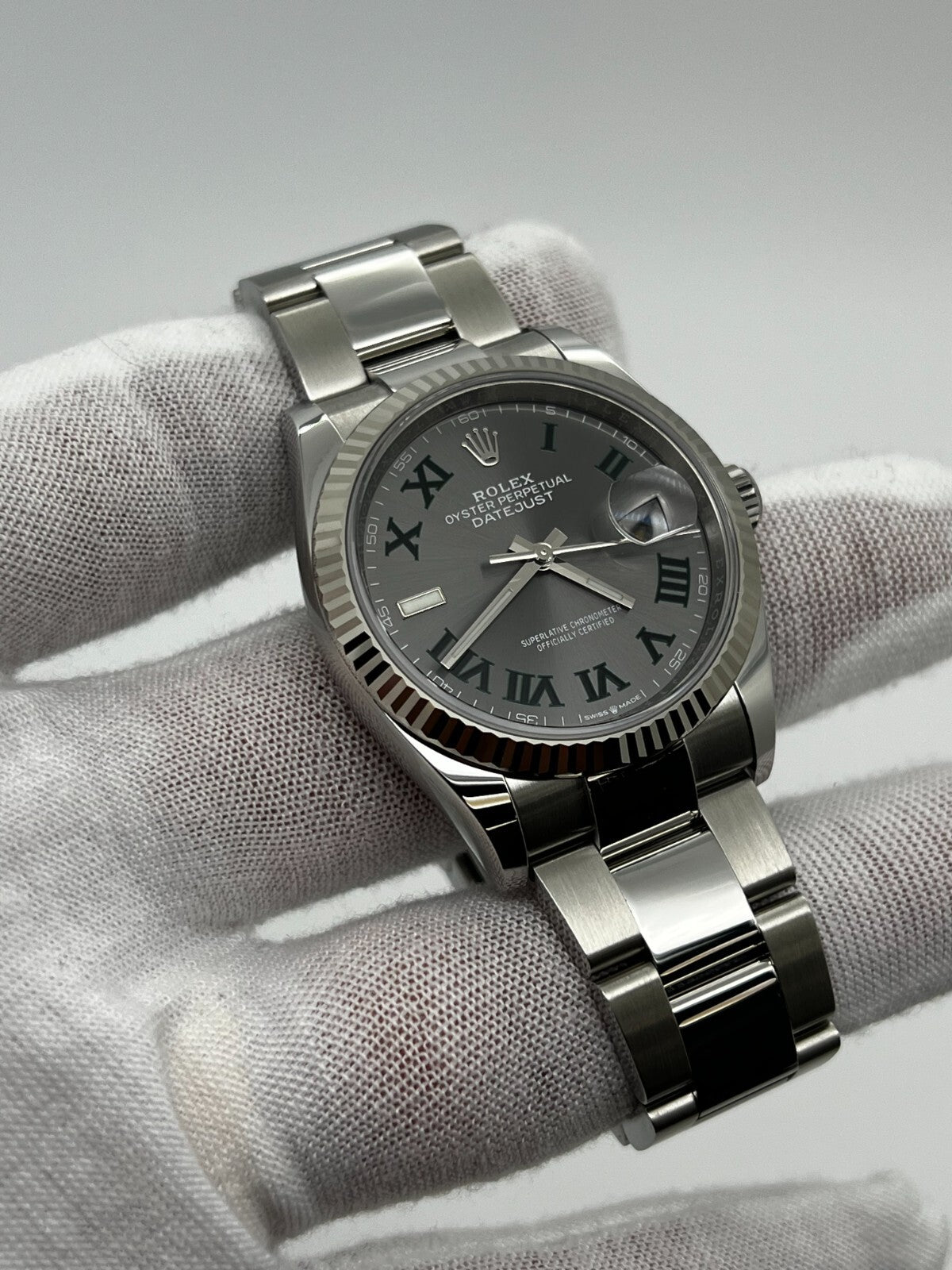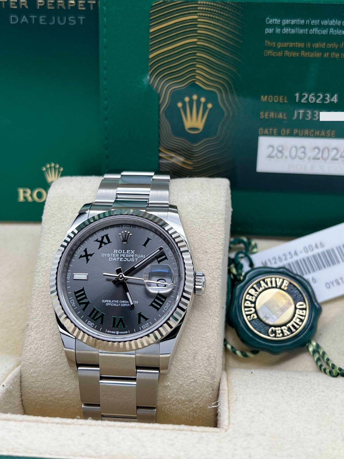 2024 Rolex Datejust 126234 Slate Wimbledon Dial 18k Gold Bezel Steel Box Paper Rolex Sale! from 1289500 /per This item is a recurring or deferred purchase. By continuing, I agree to the cancellation policy and authorize you to charge my payment method at the prices, frequency and dates listed on this page until my order is fulfilled or I cancel, if permitted. +1 (619) 232-1273 This item is currently on backorder but you can still purchase it now and we'll ship as soon as more become available. Style Number: 126234Serial: JT332***Year: 2024 Model: Rolex Datejust Case Material: Stainless Steel Band: Stainless Steel Bezel: 18K White Gold Fluted Dial: Slate Wimbledon Face: Sapphire Crystal Case Size: 36mm Includes: -Rolex Box & Paper-Certified Appraisal -5 Year Factory Warranty from Original Purchase Date SKU 21462 / 129580TSD072624