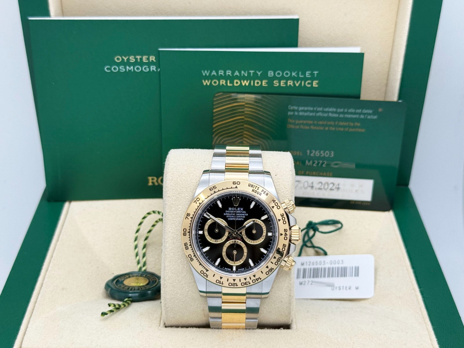 2024 Rolex Daytona 126503 Black Dial 18K Yellow Gold Stainless Steel Box Paper Rolex Sale! from 2699500 /per This item is a recurring or deferred purchase. By continuing, I agree to the cancellation policy and authorize you to charge my payment method at the prices, frequency and dates listed on this page until my order is fulfilled or I cancel, if permitted. +1 (619) 232-1273 This item is currently on backorder but you can still purchase it now and we'll ship as soon as more become available. Style Number: 126503Serial: 711L0***Year: 2024 Model: Rolex Cosmograph Daytona Case Material: Stainless Steel Band: 18K Yellow Gold & Stainless Steel Bezel: 18K Yellow Gold Dial: Black Crystal: Sapphire Crystal Case Size: 40mm Includes: - Rolex Box & Paper- Certified Appraisal - Five Year Factory Warranty from Original Purchase DateSKU 23079 / 169075TSD092425SF