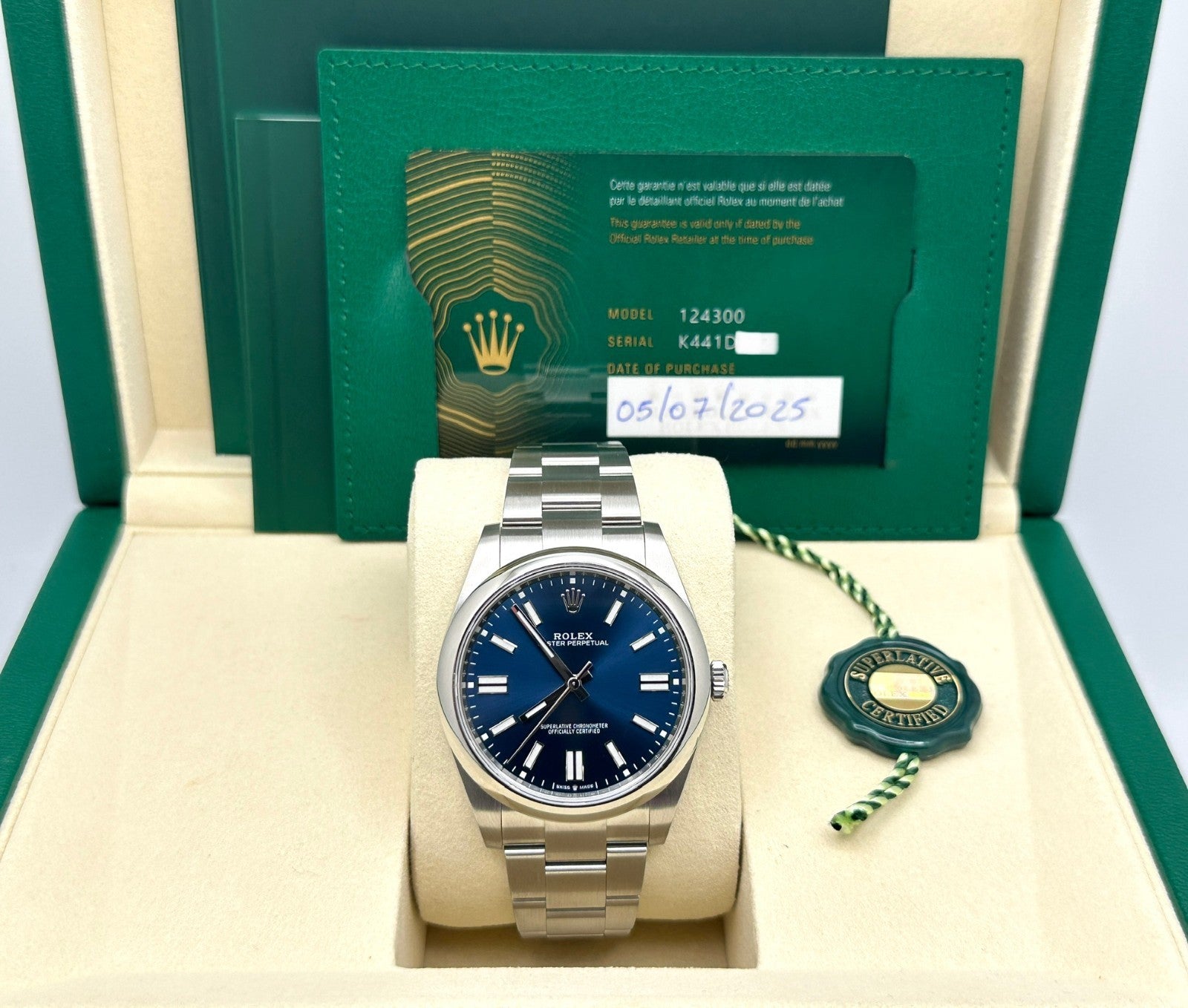 2025 Rolex Oyster Perpetual 124300 41mm Blue Dial Stainless Steel Box Paper Rolex Sale! from 1029500 /per This item is a recurring or deferred purchase. By continuing, I agree to the cancellation policy and authorize you to charge my payment method at the prices, frequency and dates listed on this page until my order is fulfilled or I cancel, if permitted. +1 (619) 232-1273 This item is currently on backorder but you can still purchase it now and we'll ship as soon as more become available. Style Number: 124300Serial: K441D***Year: 2025 Model: Rolex Oyster Perpetual Case Material: Stainless Steel Band: Stainless Steel Bezel: Stainless Steel Dial: Blue Crystal: Sapphire Crystal Case Size: 41mm Includes: - Rolex Box & Paper- Certified Appraisal - Five Year Factory Warranty from Original Purchase DateSKU 23339 / 118825TLK111725