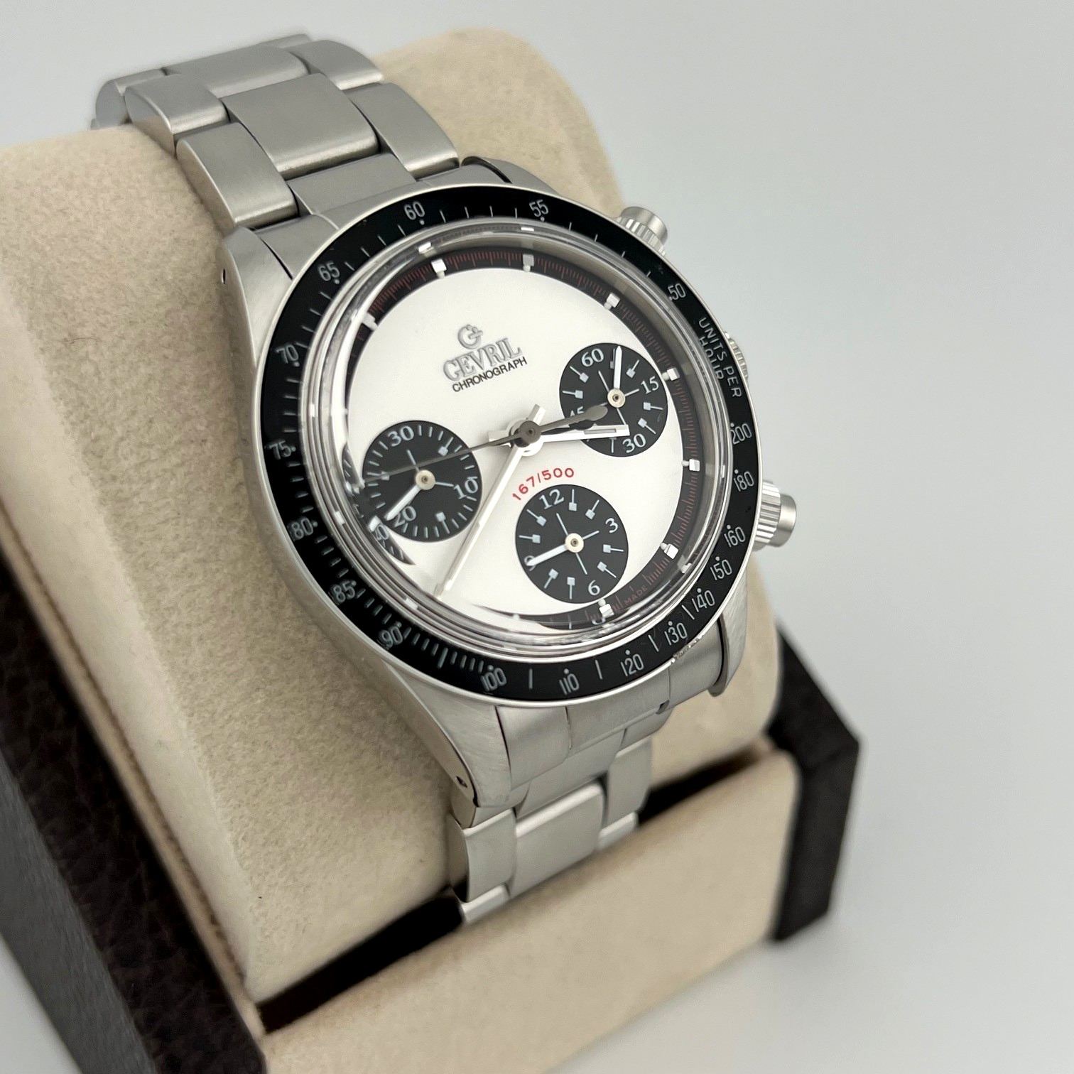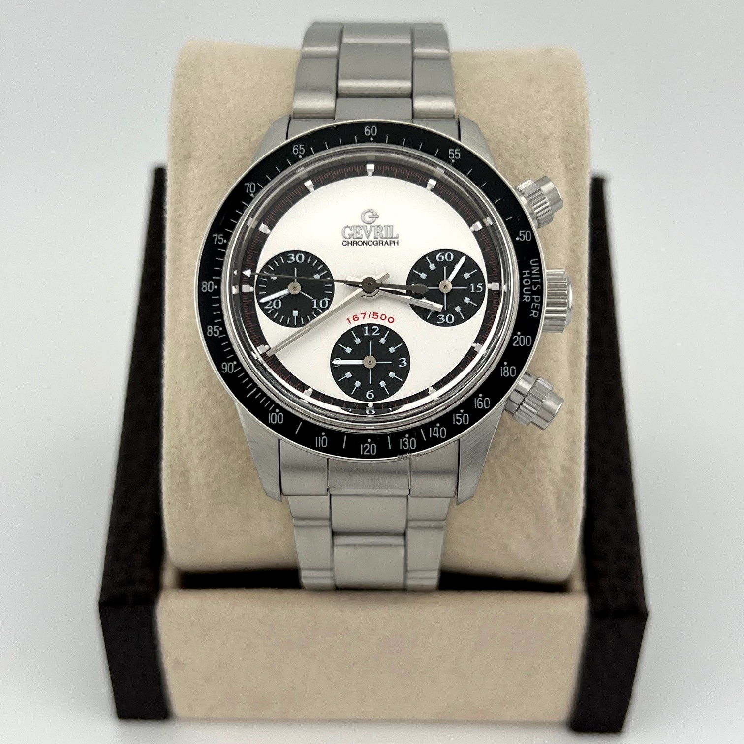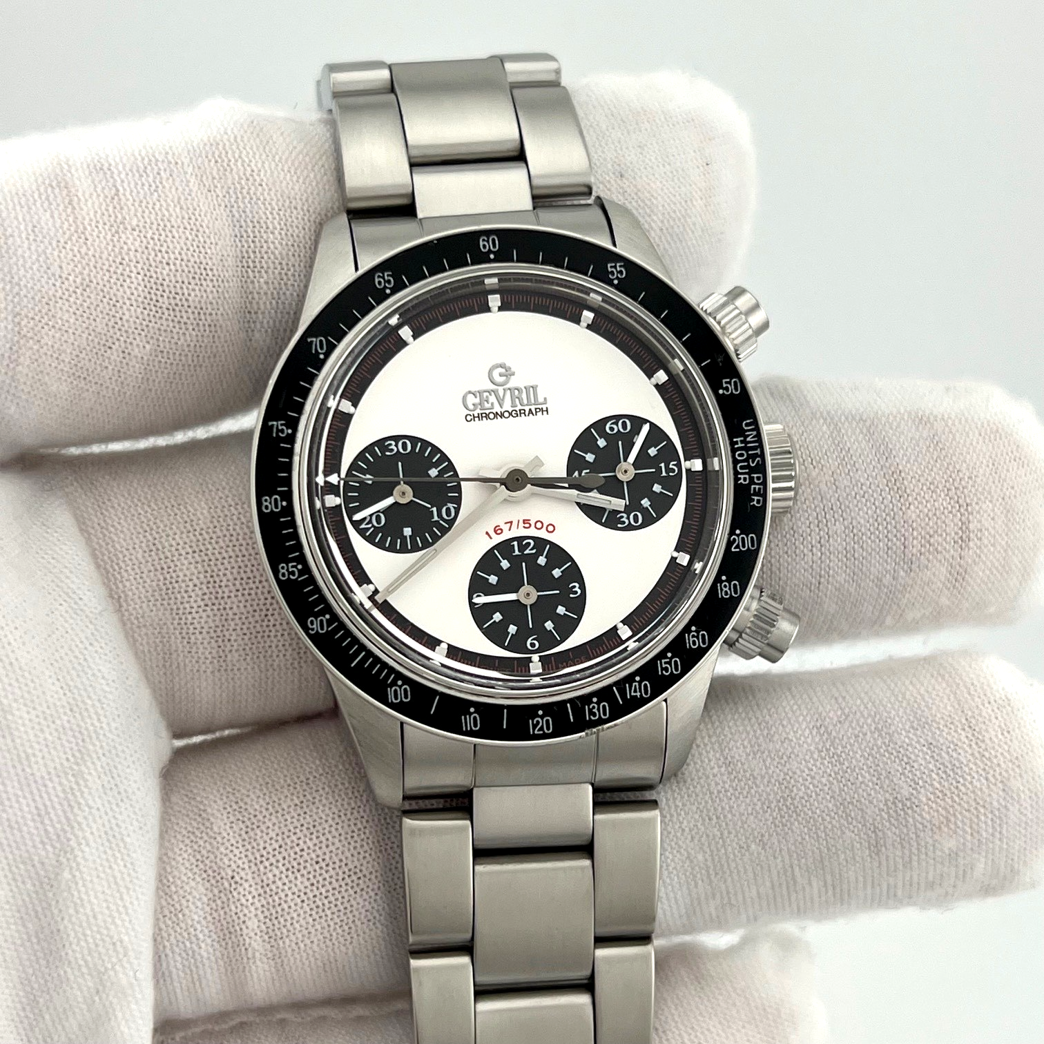 Style Number: A9508.A.ACC / R005 Year: Circa 1999 - Early 2000's Serial: 1**/500 Model: Gevril Tribeca Paul Newman Case Material: Stainless Steel Band: Stainless Steel (Slight wear on the clasp - we did not have this watch polished) Bezel: Black Dial: White Crystal: Sapphire Case Size: 37mm Includes: - Gevril Box & Papers - Certified Appraisal - 1 Year Warranty SKU 22979 / 12937TOC082625