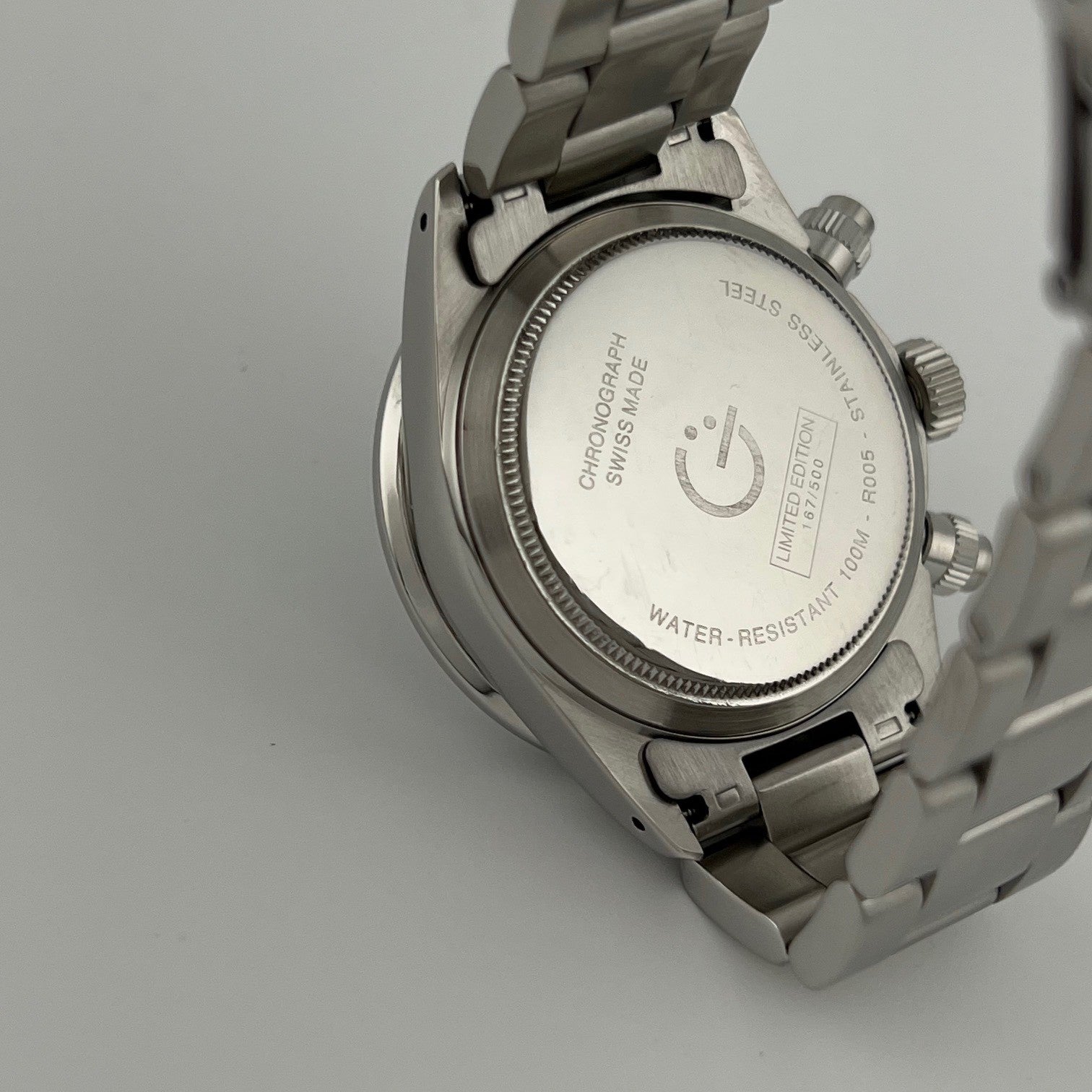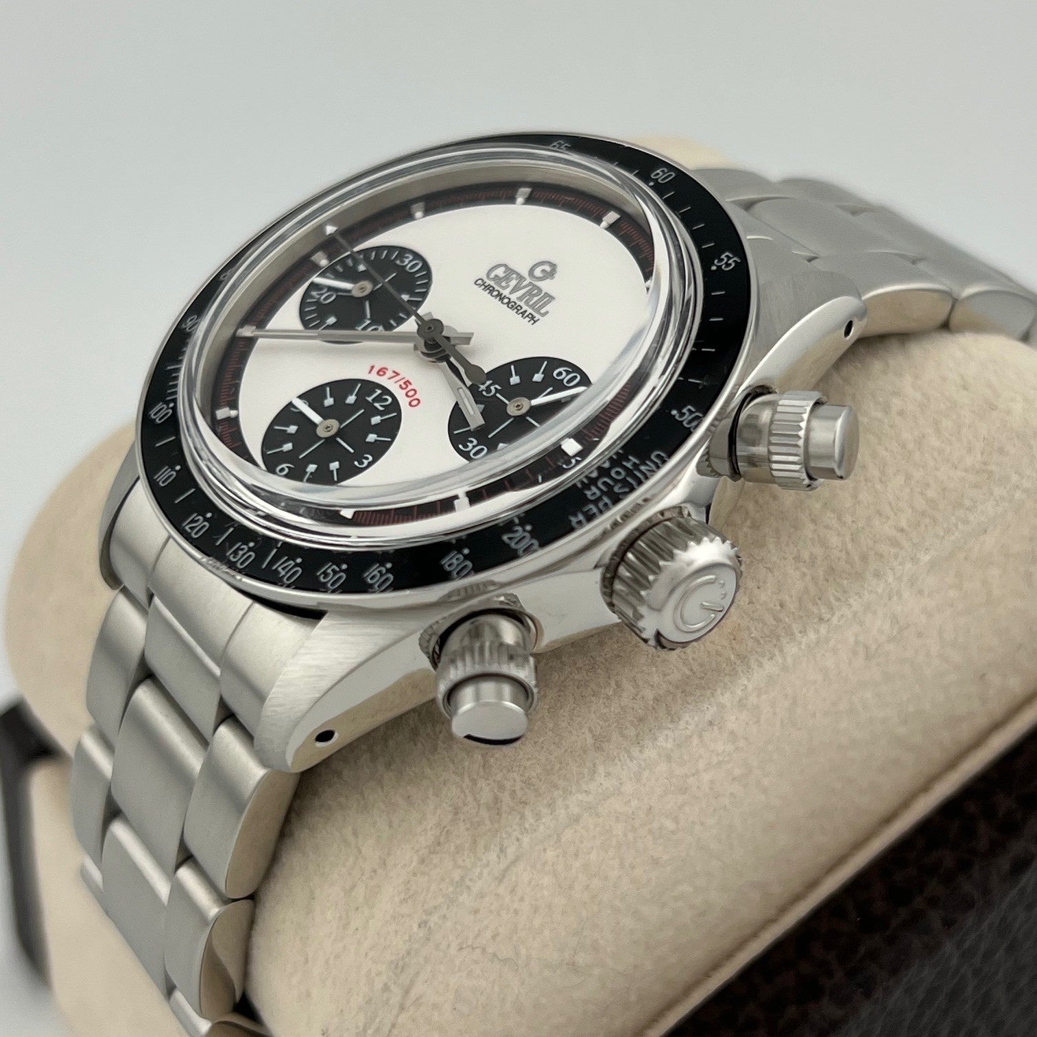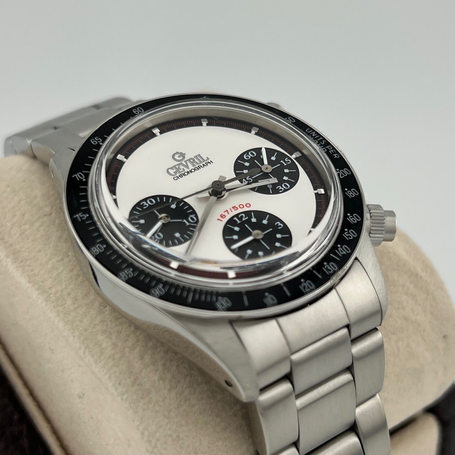 Style Number: A9508.A.ACC / R005 Year: Circa 1999 - Early 2000's Serial: 1**/500 Model: Gevril Tribeca Paul Newman Case Material: Stainless Steel Band: Stainless Steel (Slight wear on the clasp - we did not have this watch polished) Bezel: Black Dial: White Crystal: Sapphire Case Size: 37mm Includes: - Gevril Box & Papers - Certified Appraisal - 1 Year Warranty SKU 22979 / 12937TOC082625