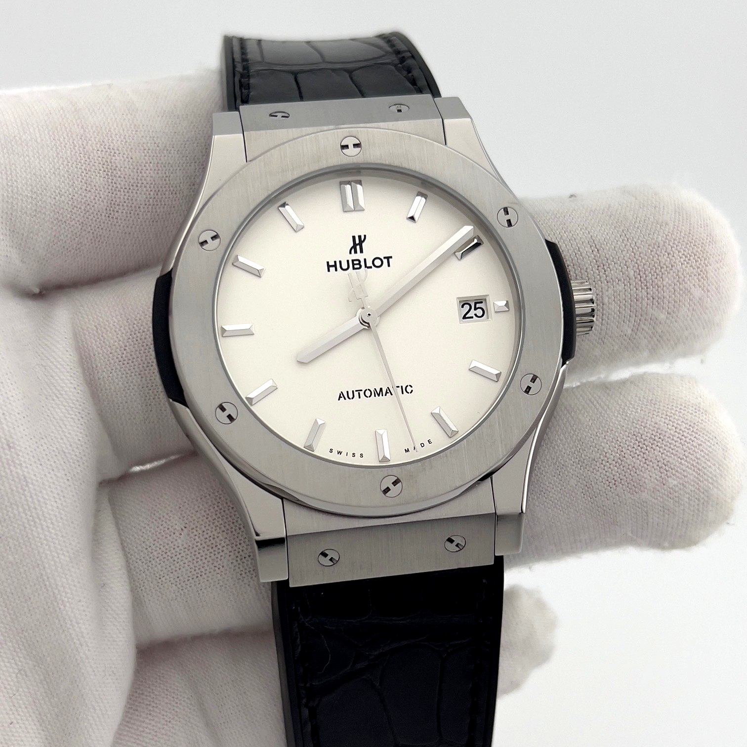 Hublot Classic Fusion 511.NX.2611.LR 45mm White Opaline Dial Titanium Box Hublot Sale! from 529500 /per This item is a recurring or deferred purchase. By continuing, I agree to the cancellation policy and authorize you to charge my payment method at the prices, frequency and dates listed on this page until my order is fulfilled or I cancel, if permitted. +1 (619) 232-1273 This item is currently on backorder but you can still purchase it now and we'll ship as soon as more become available. Style Number: 511.NX.2611.LRSerial: 112**** Model: Hublot Classic Fusion Case Material: Titanium Band: Leather Bezel: Titanium Dial: Opaline (White) Crystal: Sapphire Case Size: 45mm Includes: - Hublot Box- Certified Appraisal - 1 Year WarrantySKU 23038 / 19600TSTADEN090825