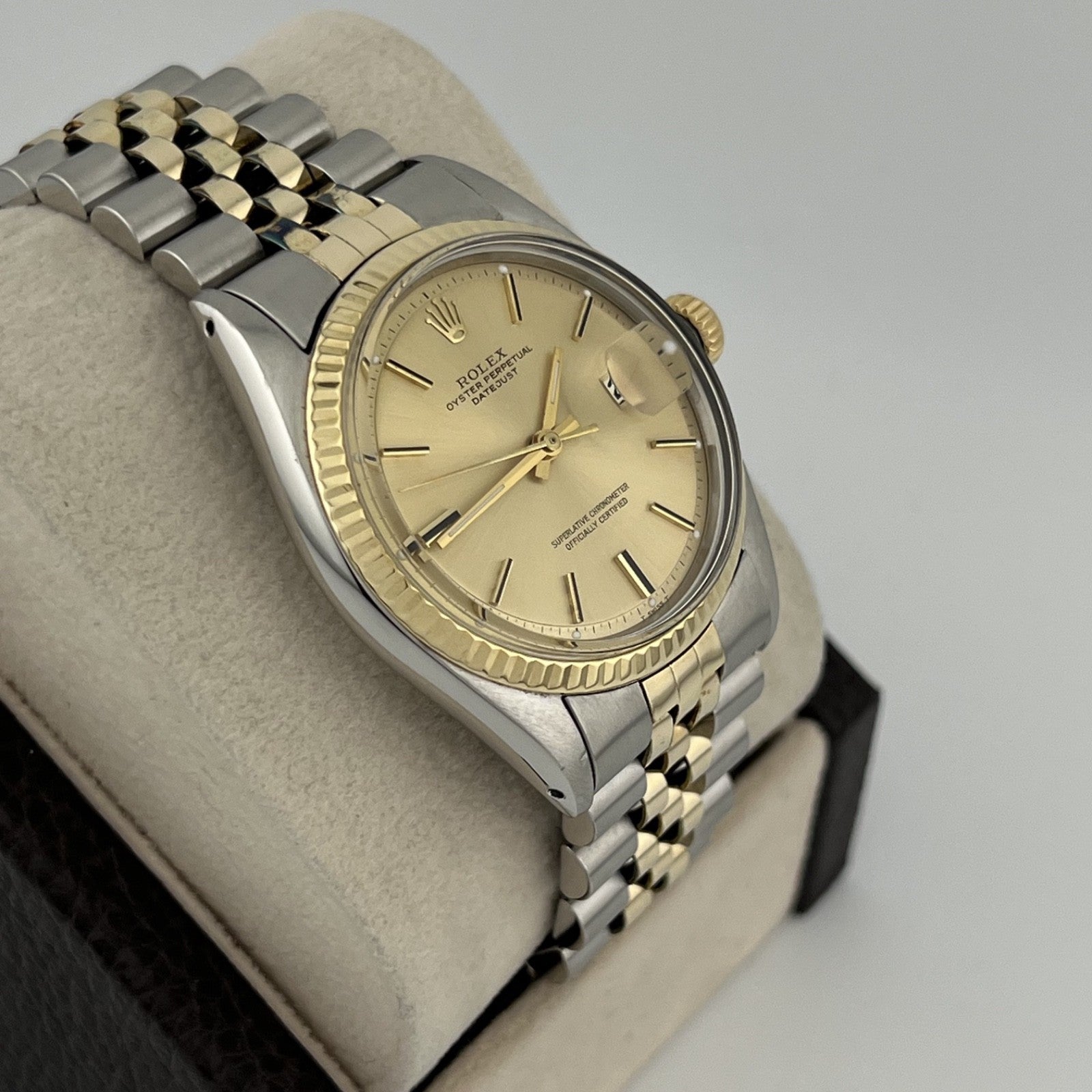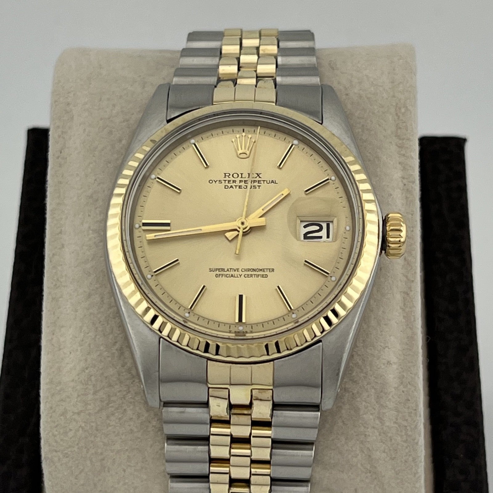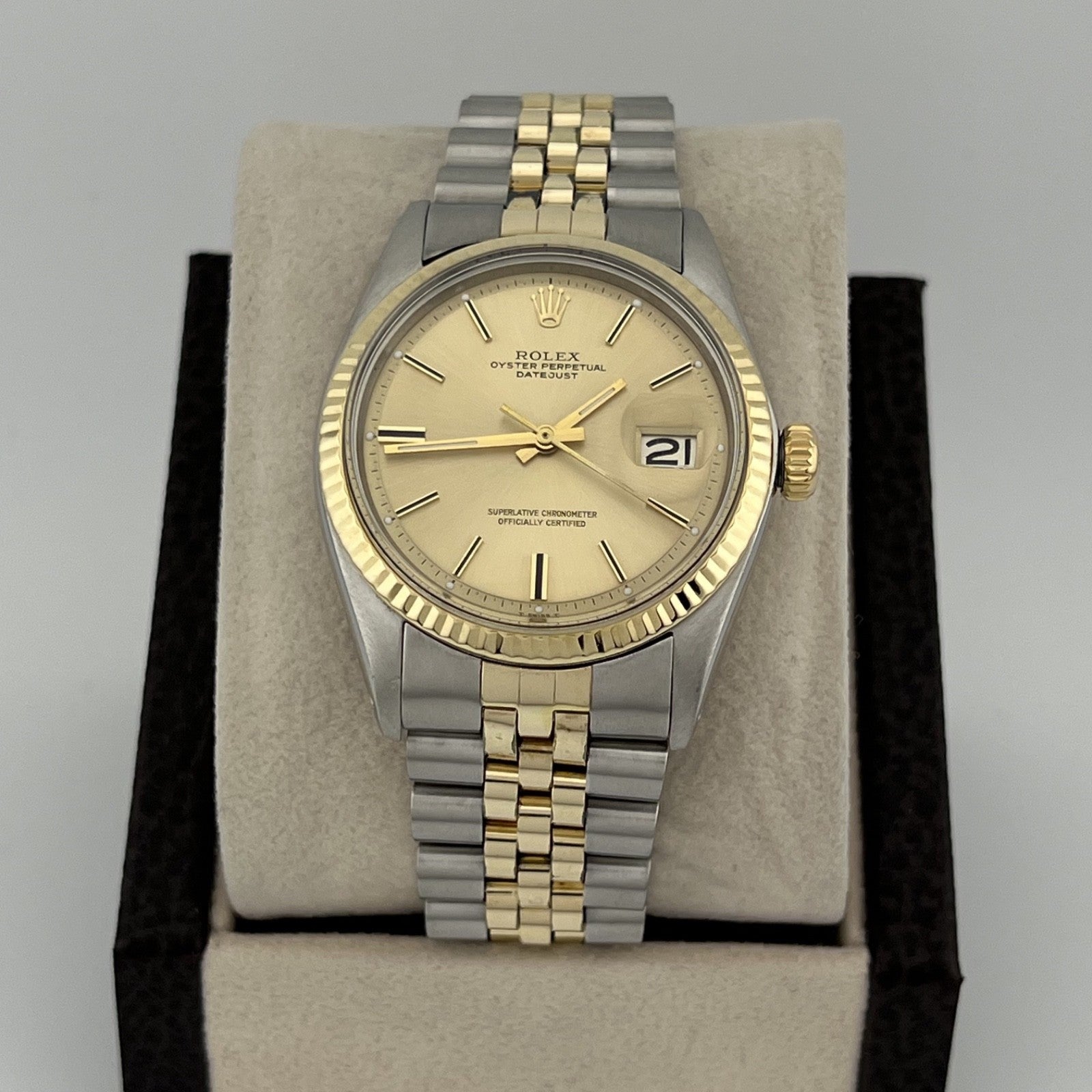 Rolex Datejust 1601 36mm Champagne Dial 14k Yellow Gold Stainless Steel Jubilee Rolex Sale! from 499500 /per This item is a recurring or deferred purchase. By continuing, I agree to the cancellation policy and authorize you to charge my payment method at the prices, frequency and dates listed on this page until my order is fulfilled or I cancel, if permitted. +1 (619) 232-1273 This item is currently on backorder but you can still purchase it now and we'll ship as soon as more become available. Style Number: 1601Serial: 350****Year: 1973 Model: Rolex Datejust Case Material: Stainless Steel Band: 14k Yellow Gold & Stainless Steel Jubilee Bezel: 14k Yellow Gold Fluted Dial: Champagne Crystal: Acrylic Case Size: 36mm Includes: - Elegant Watch Box- Certified Appraisal - 1 Year WarrantySKU 20168 / 17470TGCORE051123