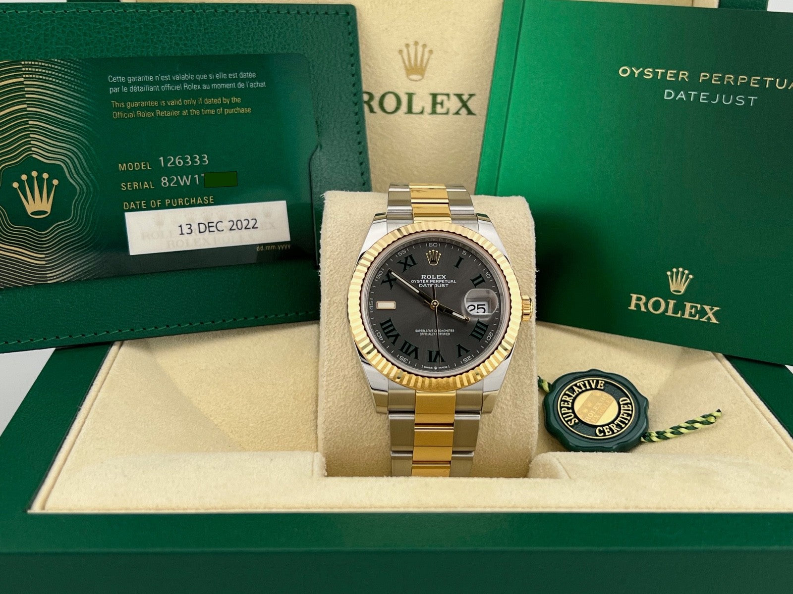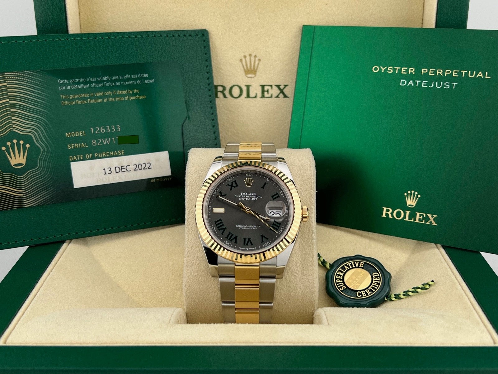 Rolex Datejust 41 Slate Wimbledon Dial 126333 18k Yellow Gold Steel Box Paper