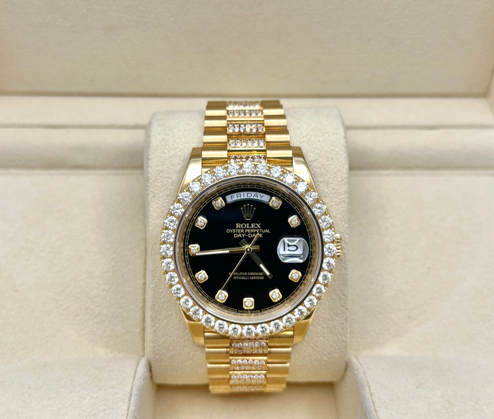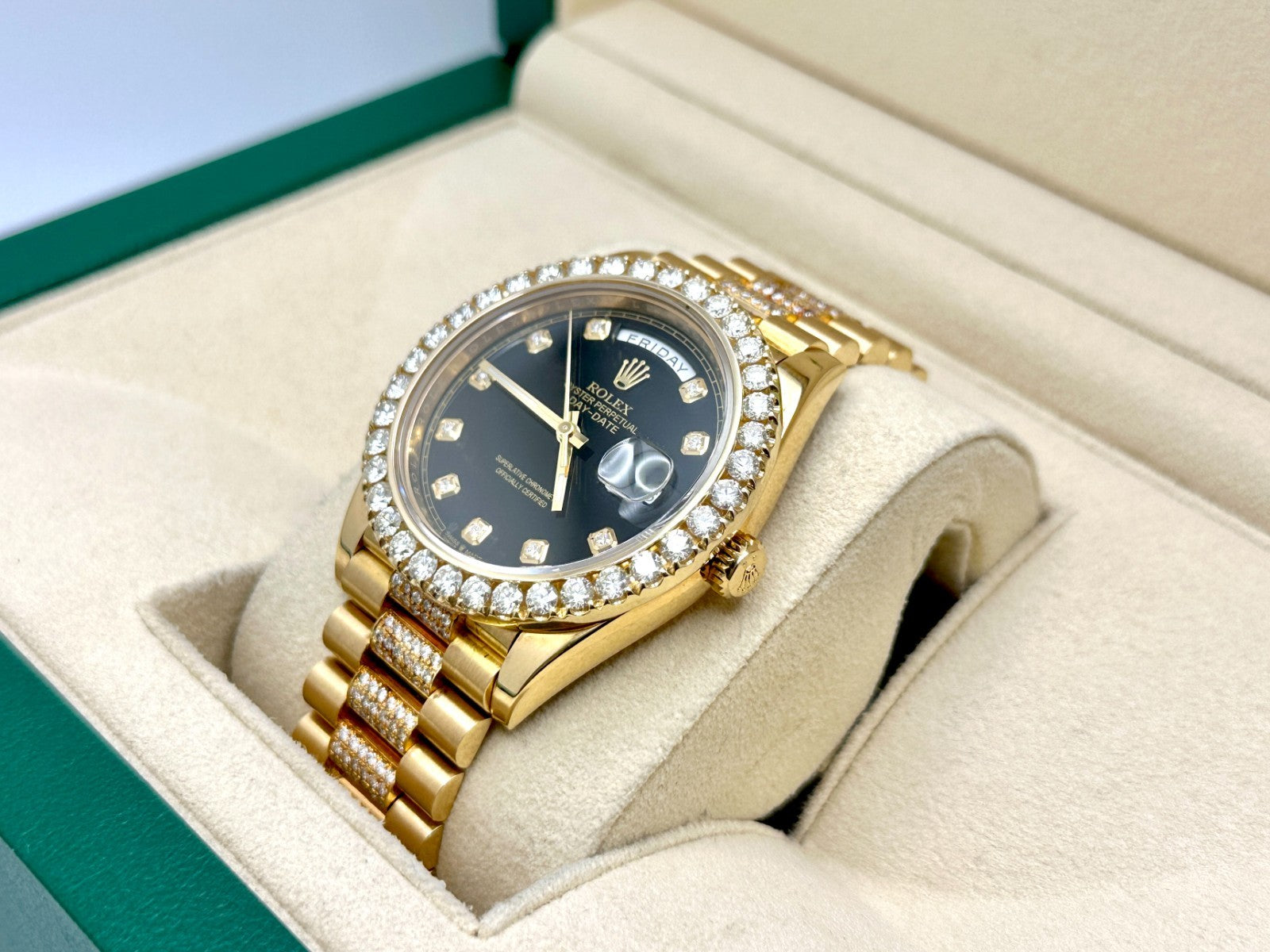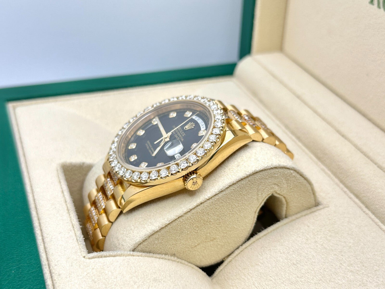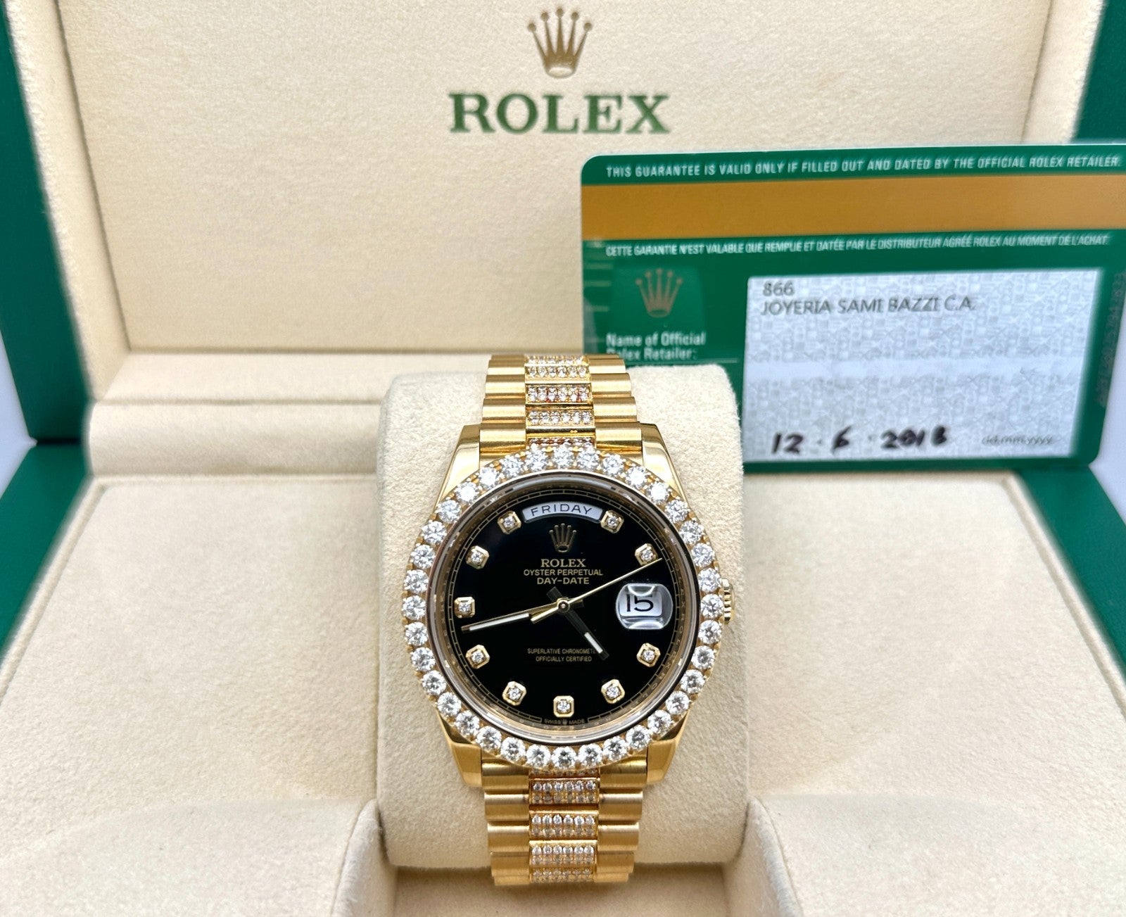 Rolex President Day Date 228238 40mm Diamond Bezel Dial Band 18K Gold Box Papers