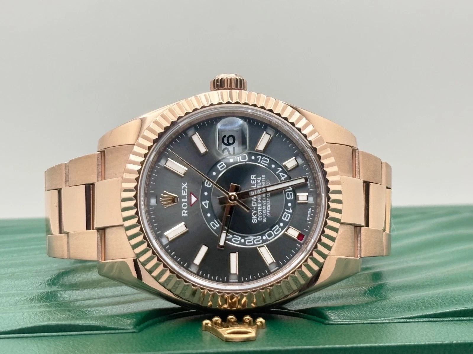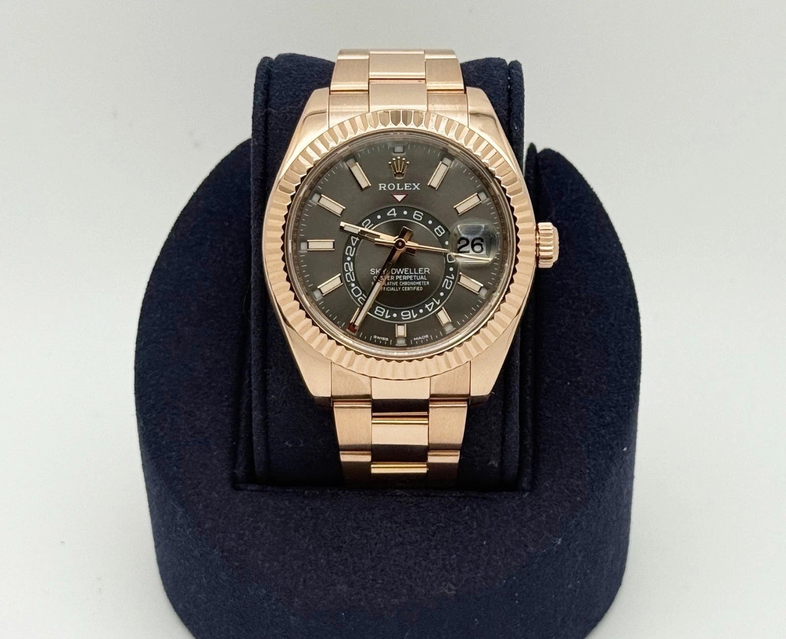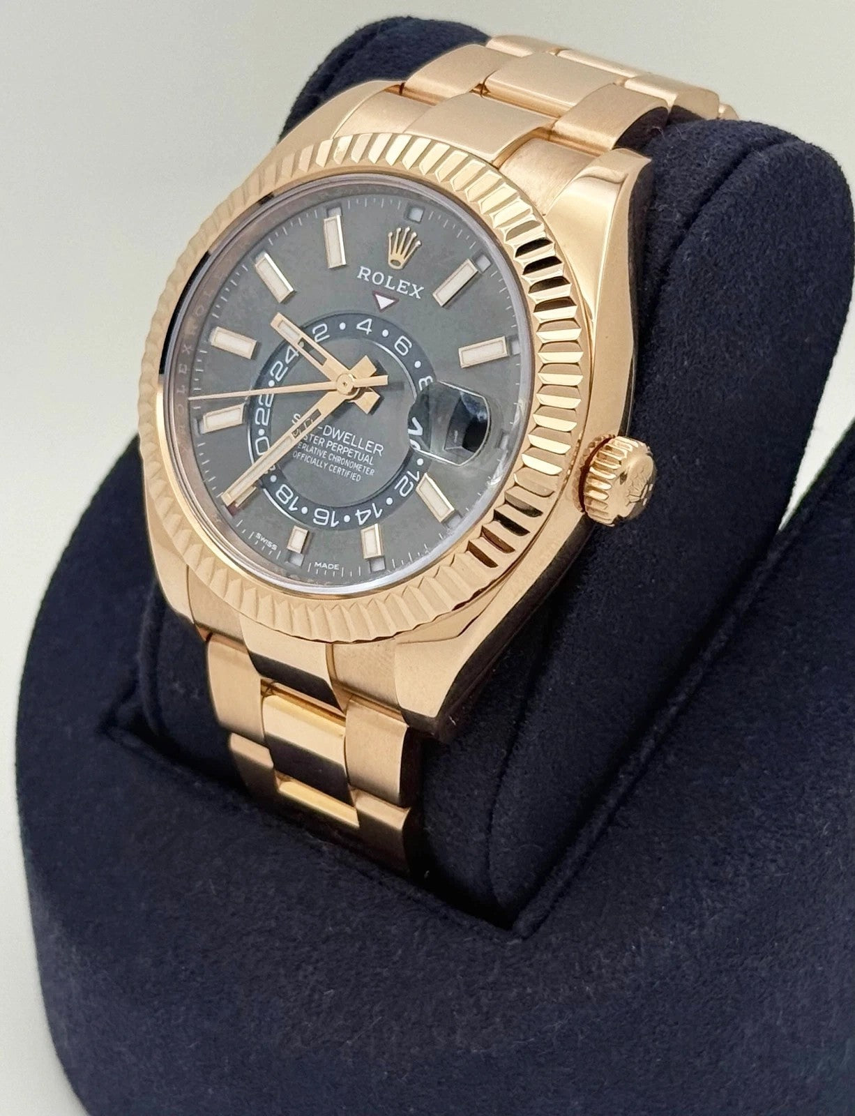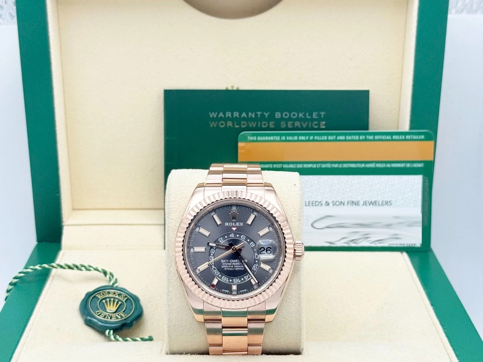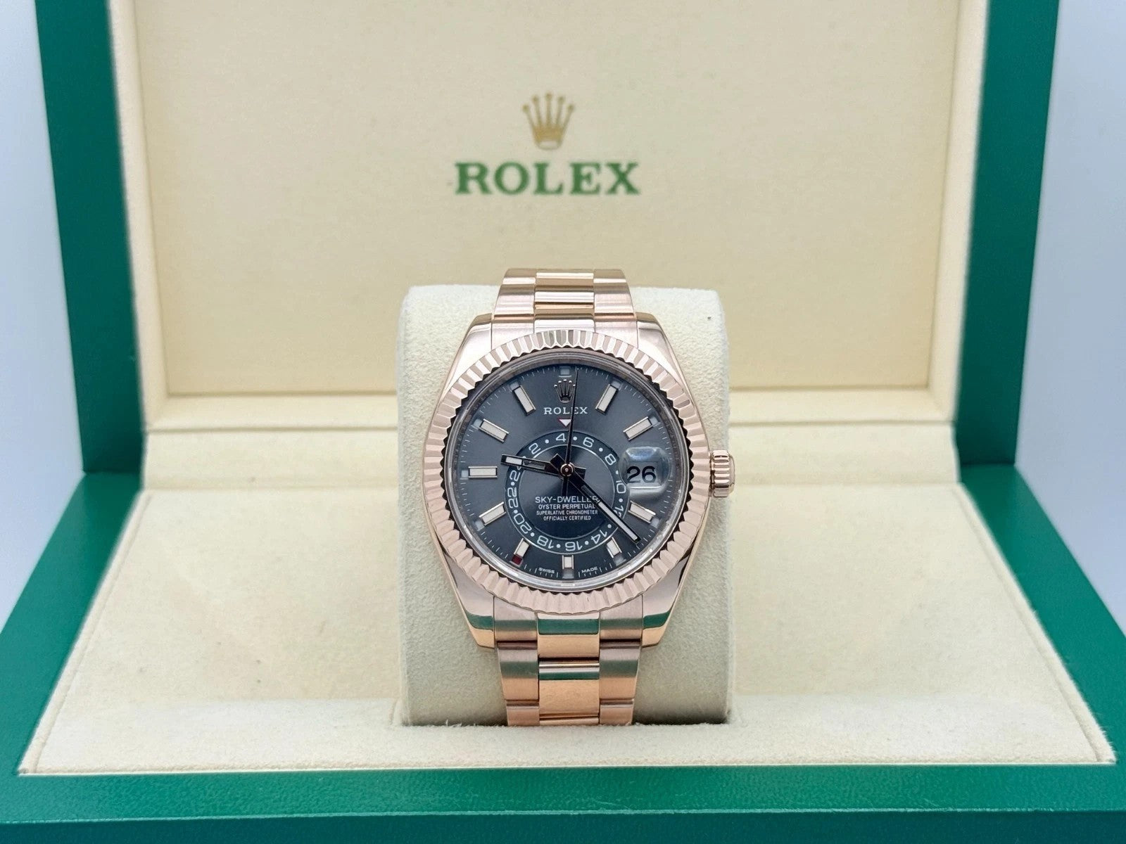 Rolex Sky Dweller 326935 42mm Dark Rhodium Dial 18k Rose Gold Box Paper Rolex Sale! from 4499500 /per This item is a recurring or deferred purchase. By continuing, I agree to the cancellation policy and authorize you to charge my payment method at the prices, frequency and dates listed on this page until my order is fulfilled or I cancel, if permitted. +1 (619) 232-1273 This item is currently on backorder but you can still purchase it now and we'll ship as soon as more become available. Style Number: 326935Serial: 544*****Year: 2020 Model: Rolex Sky Dweller Case Material: 18k Rose Gold Band: 18k Rose Gold Bezel: 18k Rose Gold Fluted Dial: Dark Rhodium Dial Crystal: Sapphire Crystal Case Size: 42mm Includes: - Rolex Box & Paper- Certified Appraisal - 1 Year WarrantySKU 23048 / 1106650TBJ091625SF