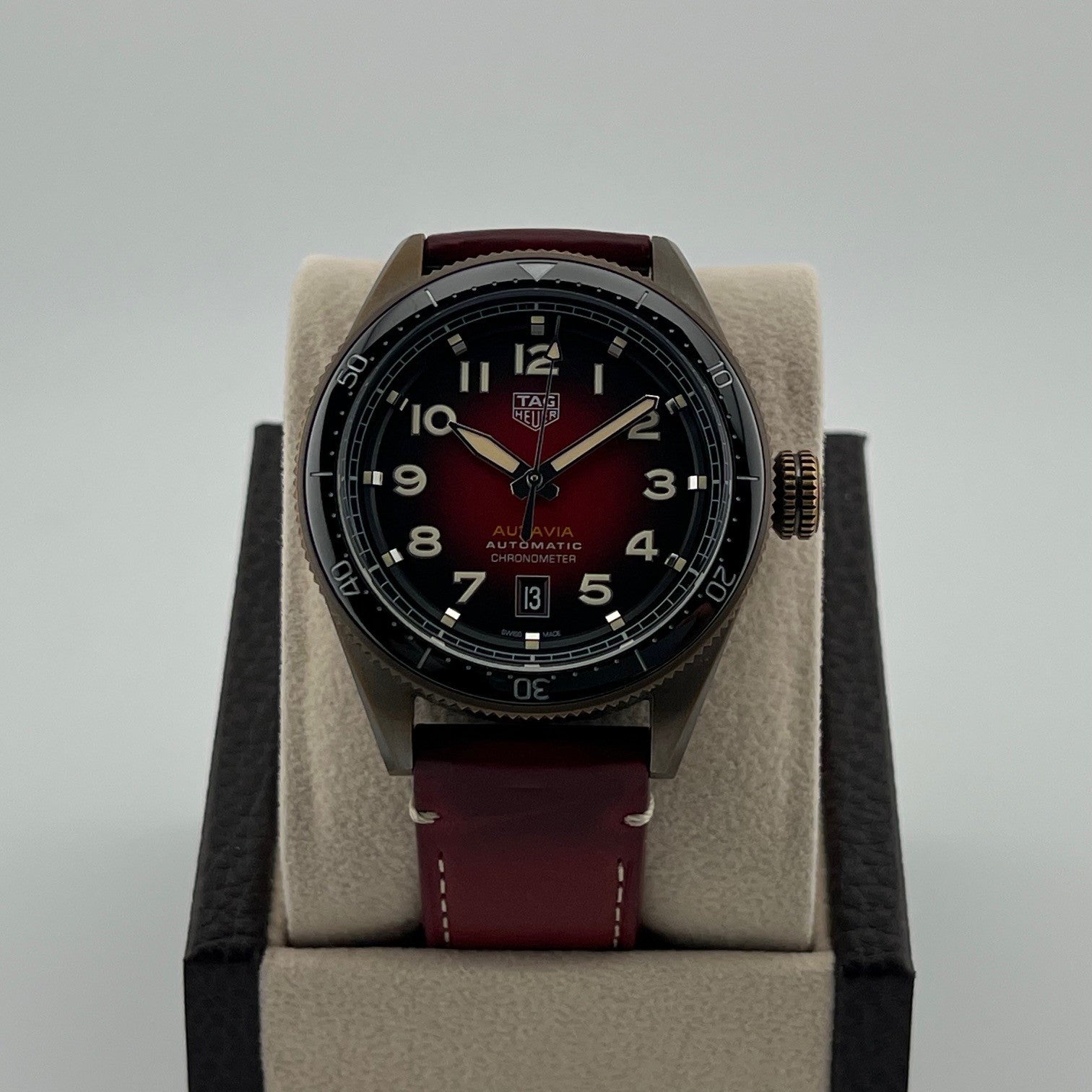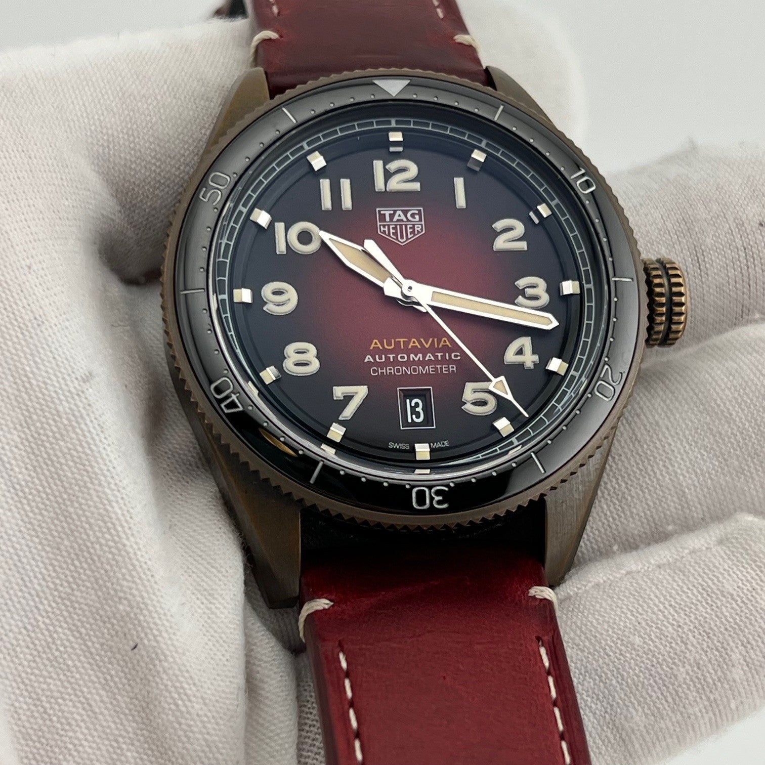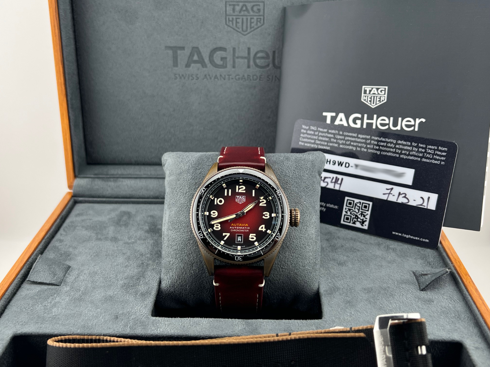 TAG Heuer Autavia Automatic WBE5192.FC8300 42mm Red Dial Bronze Box Paper TAG Heuer Sale! from 349500 /per This item is a recurring or deferred purchase. By continuing, I agree to the cancellation policy and authorize you to charge my payment method at the prices, frequency and dates listed on this page until my order is fulfilled or I cancel, if permitted. +1 (619) 232-1273 This item is currently on backorder but you can still purchase it now and we'll ship as soon as more become available. Style Number: WBE5192.FC8300Serial: H9WD-****-****Year: 2021 Model: TAG Heuer Autavia Case Material: Bronze Band: Leather Bezel: Black Ceramic Dial: Red Crystal: Sapphire Case Size: 42mm Includes: -TAG Heuer Box & Paper-Certified Appraisal -1 Year WarrantySKU 23045 / 14746TOC091225