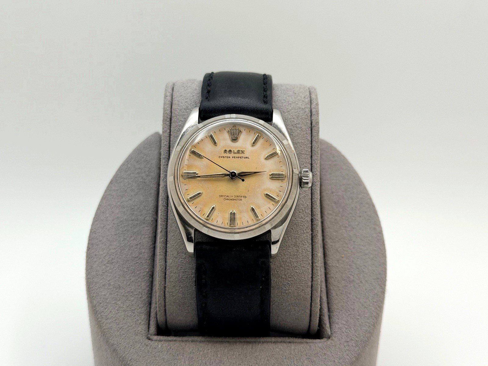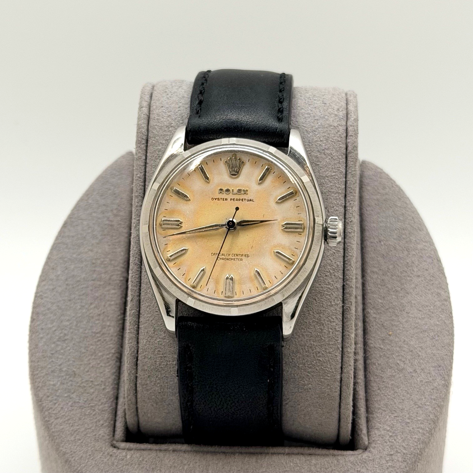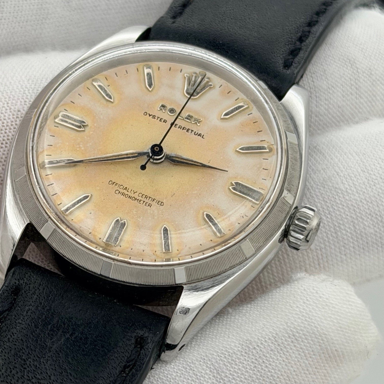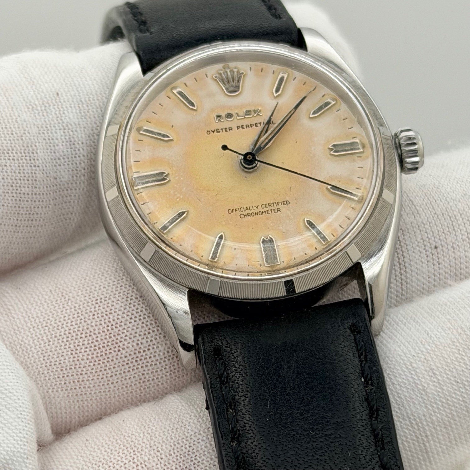 Vintage Rolex Oyster Perpetual 6565 34mm Tropical Dial Stainless Steel Leather Rolex Sale! from 499500 /per This item is a recurring or deferred purchase. By continuing, I agree to the cancellation policy and authorize you to charge my payment method at the prices, frequency and dates listed on this page until my order is fulfilled or I cancel, if permitted. +1 (619) 232-1273 This item is currently on backorder but you can still purchase it now and we'll ship as soon as more become available. Style Number: 6565 Serial: 341*** Year: 1958 Model: Vintage Rolex Oyster Perpetual Case Material: Stainless Steel Band: Custom Leather Strap Bezel: Stainless Steel Dial: Tropical Crystal: Acrylic Case Size: 34mm Includes: - Elegant Watch Box- Certified Appraisal - One Year WarrantySKU 23454 / 13537TSTADEN120125